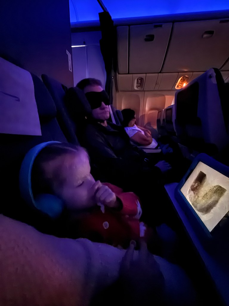 We are somewhere over the Atlantic now where Millie is upholding her lifelong record of refusing to sleep on a plane. Nick on the other hand is in a deep slumber thanks to his Face Bra (softly padded cups for each eye). The only brief moment of drama so far was millie kicking over a cup of milk and me yelping “fuck!” slightly too loud while everyone around us attempted to sleep.
