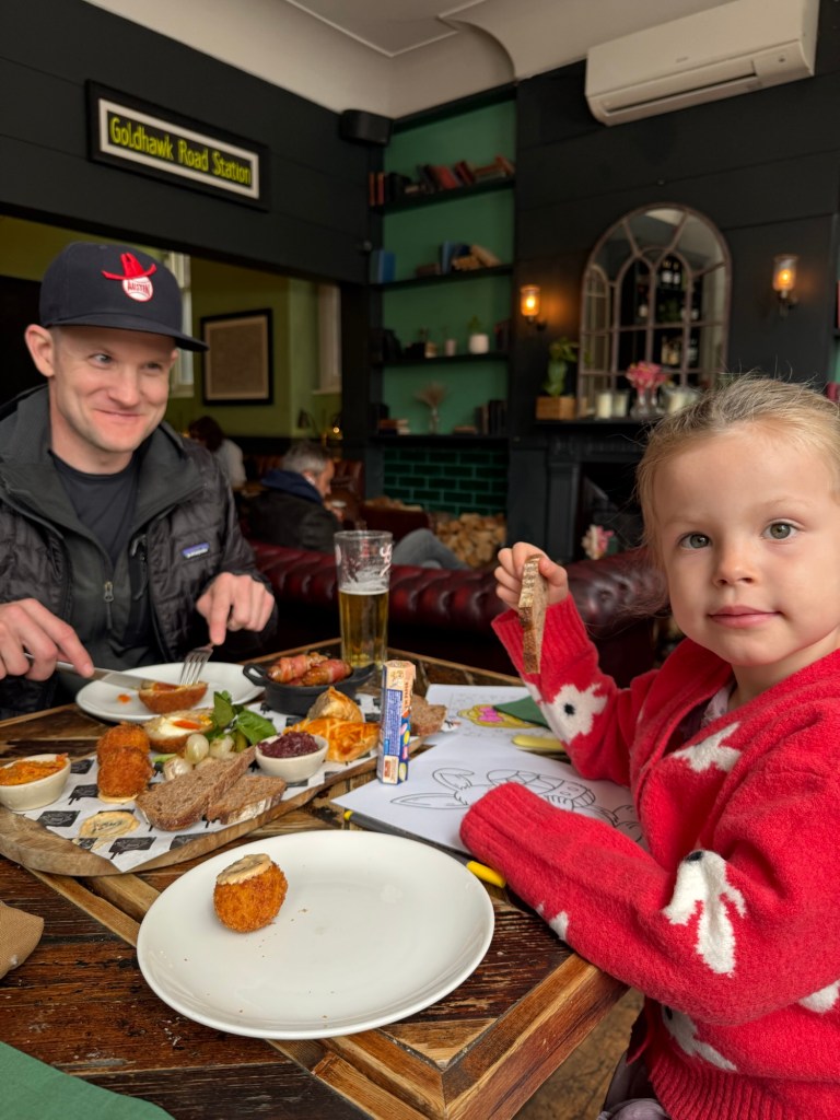We walked to the local shops to get some healthyish snacks to have on hand (plus smarties and monster munch for good measure). We stopped at a pub to have our first big English meal. Millie ate only dry bread and I said a silent prayer that this year will cure her of her semi-picky eating.