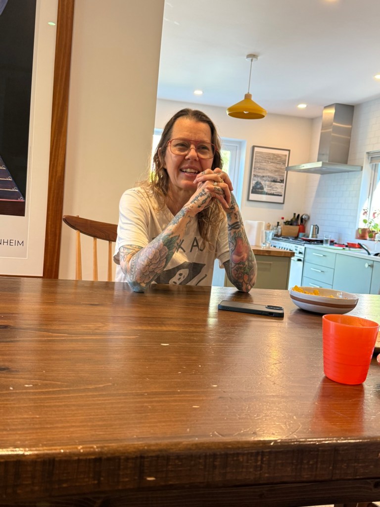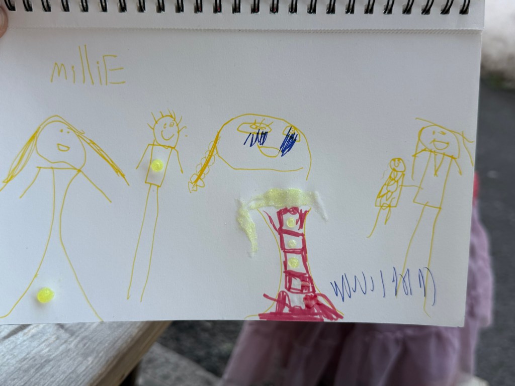 We eventually tried again, and got our well deserved afternoon pint. By now she was in good spirits and processed the incident by drawing it. Her description: me crying in the middle and dad walking on my tears with Judy to the car. The people on the left are strangers saying “what’s wrong with that girl?”