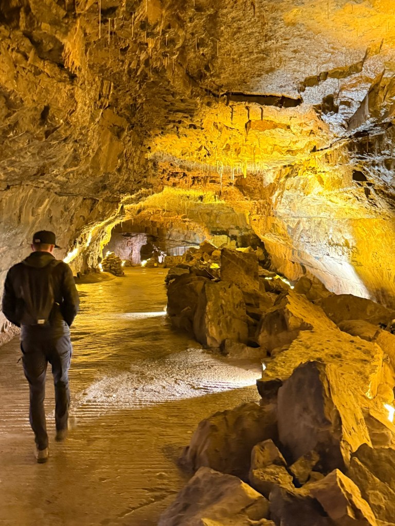 This morning we played and then headed out for the day’s planned activity, visiting Dan-ye-Ogof, also known as the “National Showcaves”. These are only about 20 miles from where we’re staying, but we’ve learned to go by drive time rather than distance. In reality it was about an hour of windy and hilly roads, with constant slow-downs and speed-ups and sudden stops to avoid hitting sheep. You can probably see where this is going.