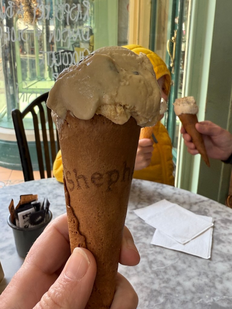 Millie woke up this morning asking for ice cream. Earlier this week we decided we needed some rules in place for when to have ice cream to prevent being asked about it every 3 minutes. Friday, today, was ice cream day. And she did not let us forget! So our first stop in Hay-on-Wye was ice cream. We parked the car and as if it had been placed there by a higher power just for us, there was Shepherd’s Parlor Ice Cream shop.