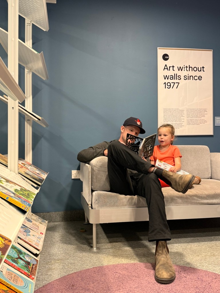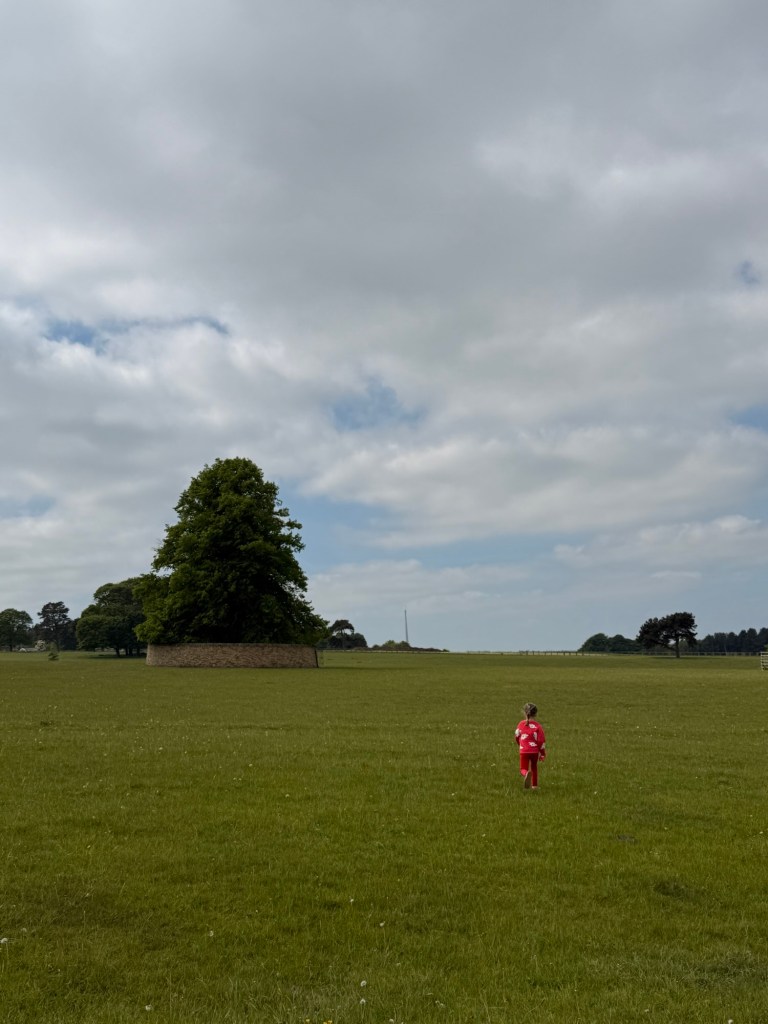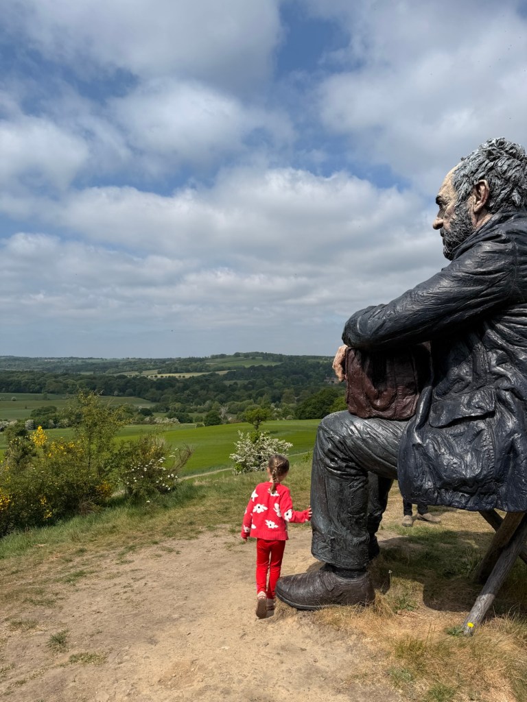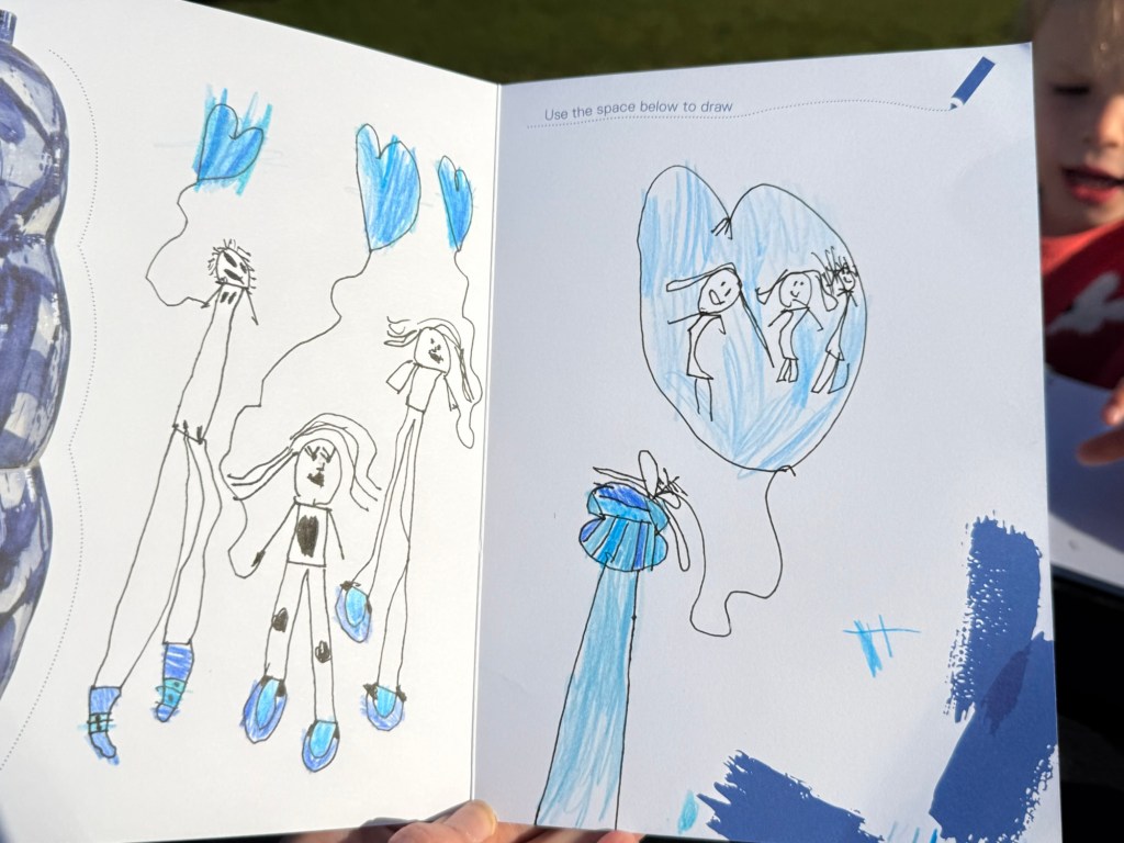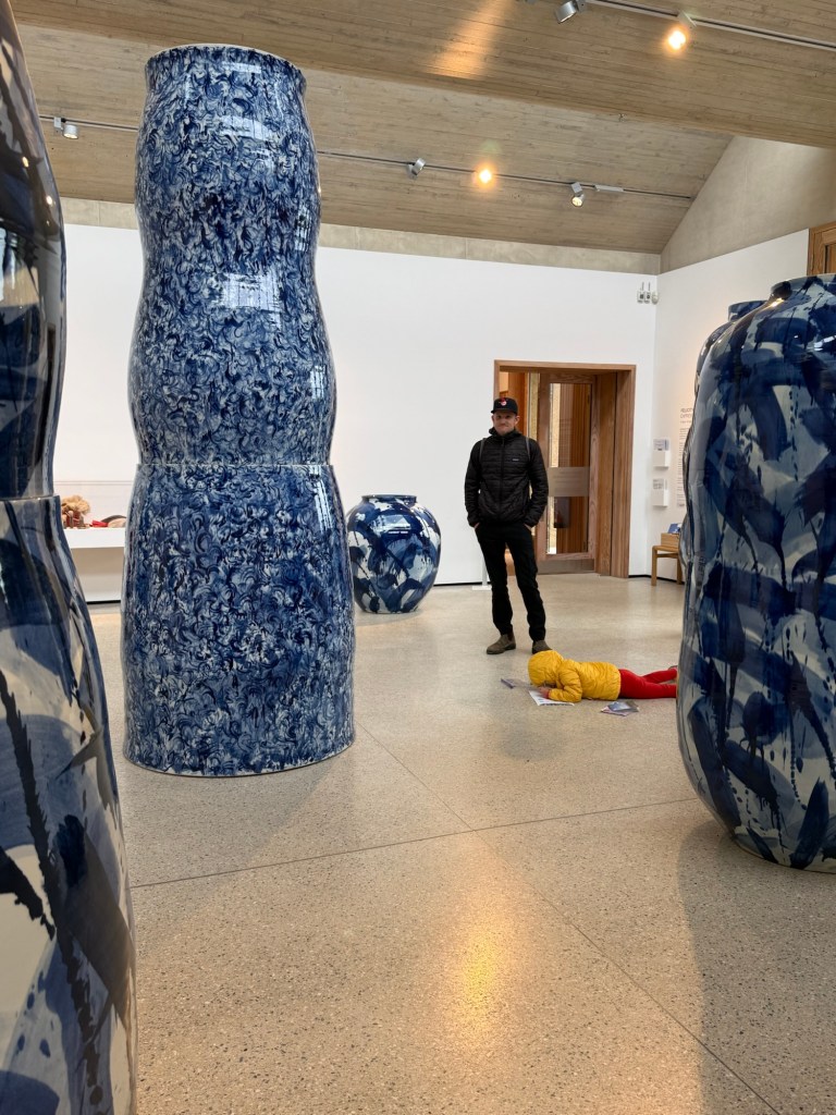 Inside one of the galleries there was an exhibit by Felicity Aylieff showcasing beautiful large blue pots. The museum set up various activities for kids, including art sets. I’ve appreciated how much the museums in England cater to kids to help them stay engaged and learn. Millie sat / lay on the floor for a while drawing our family looking at the pots, and the pot imagining our family.