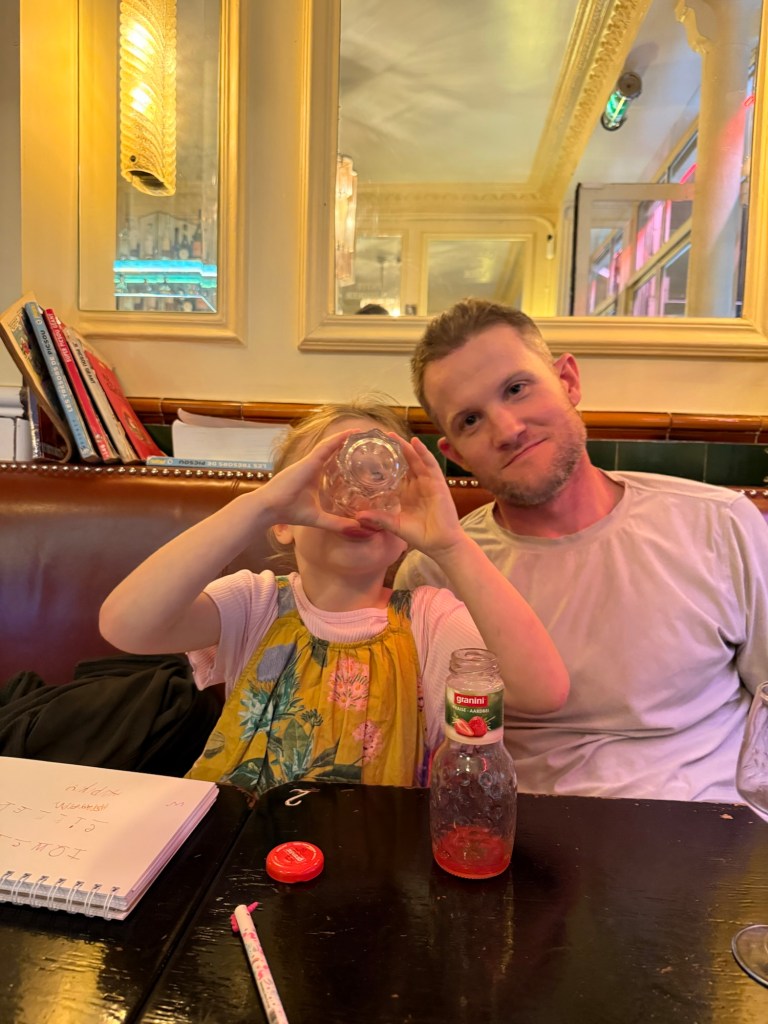 We walked around a bit checking out the local park, but at this point it was raining and a bit cold. It was 3:45pm: too late to go to another museum, too early for dinner. We attempted dinner anyway, but they told us the kitchen didn’t open until 7. We had a glass of wine and juice and then went back to our Airbnb to hang out and wait it out til 7. Here is Millie discovering strawberry juice.