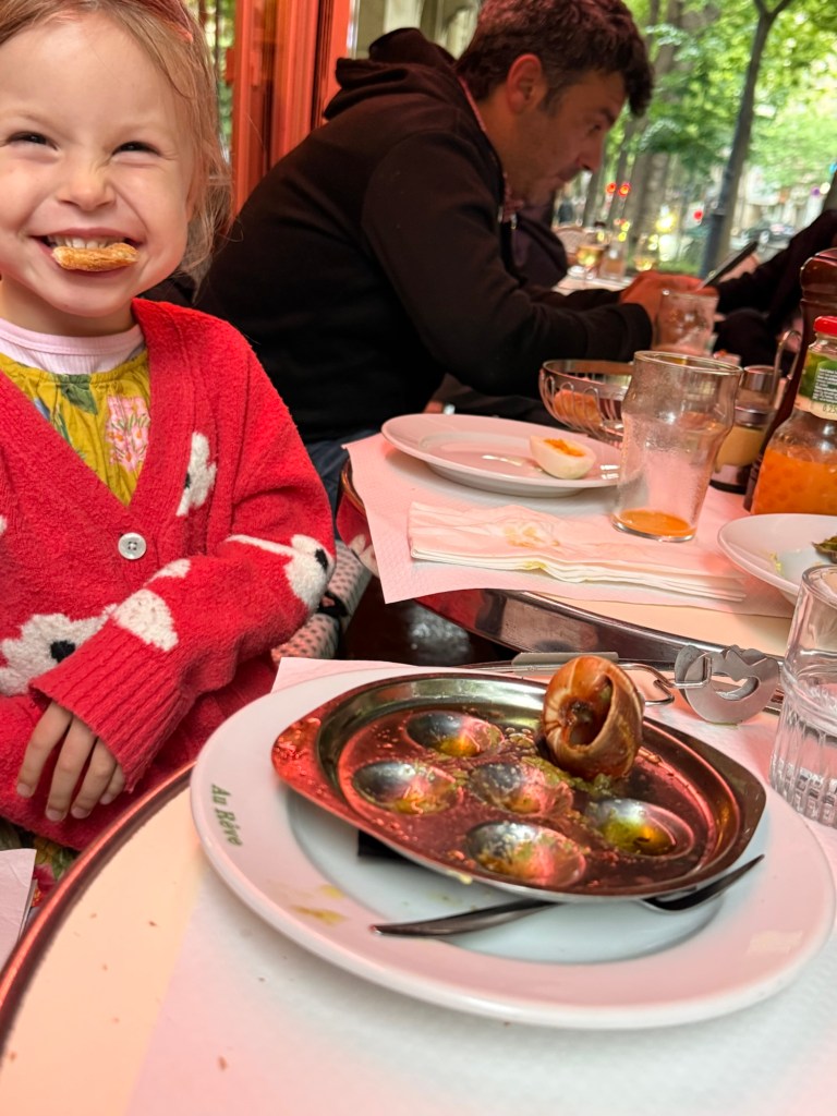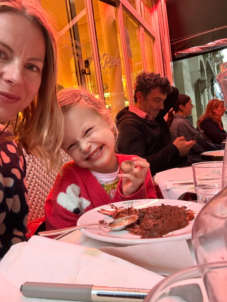 We walked to dinner. Millie ate 90% bread but tasted escargot and beef tartare, and didn’t spit them out. We wrote postcards to her friends and class. For dessert we shared my favorite dessert of all time: chocolate mousse. Nick taught her how to close her eyes and savor it, which she did mindfully.