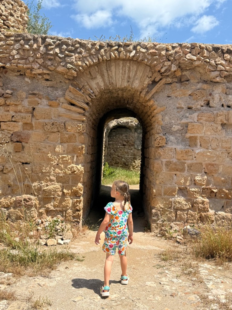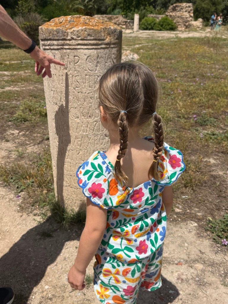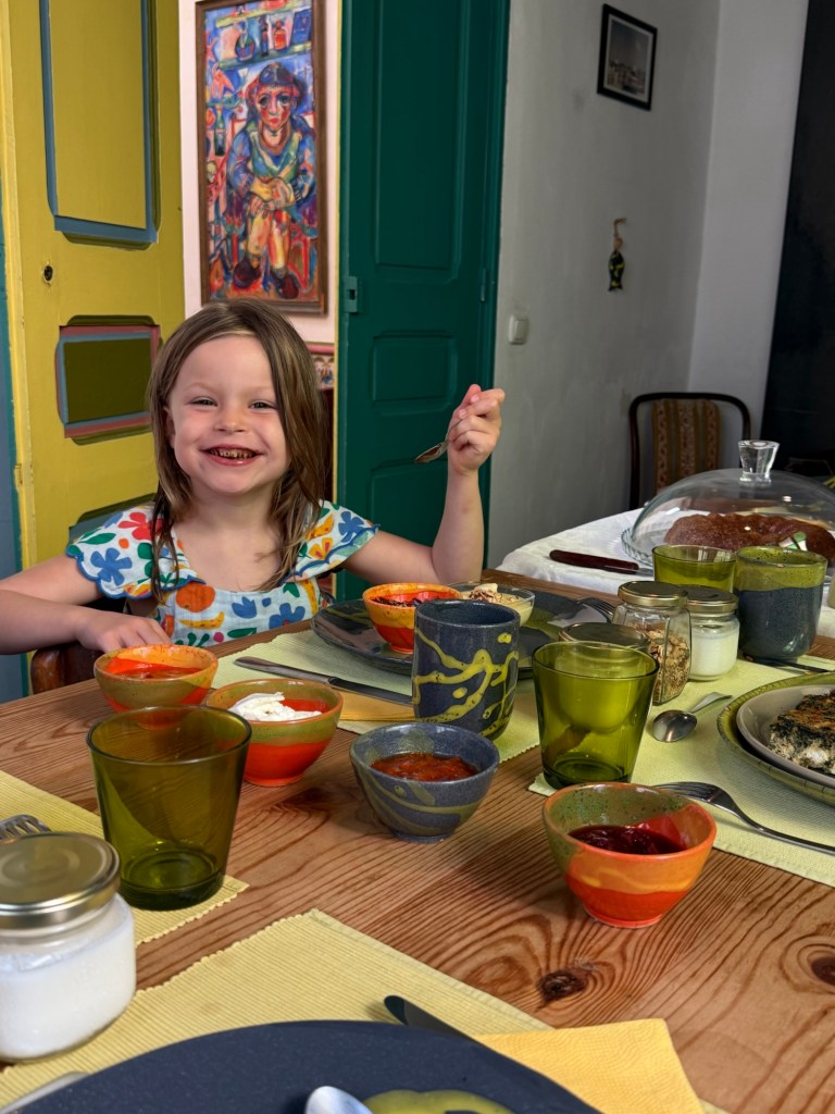 Our small bnb—I think we are the only guests so it’s more of a home stay—served us the best breakfast we’ve had yet. Warm lemony custard with almonds on top, a semi-sweet sesame cake, spinach and feta frittata, homemade yogurts, granola, jams, fresh bread, hot coffee, and a fruit smoothie. The gave Millie a small bowl of melted chocolate for some reason. She did not complain.