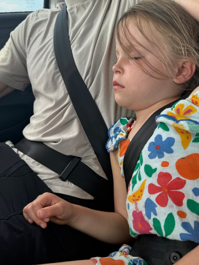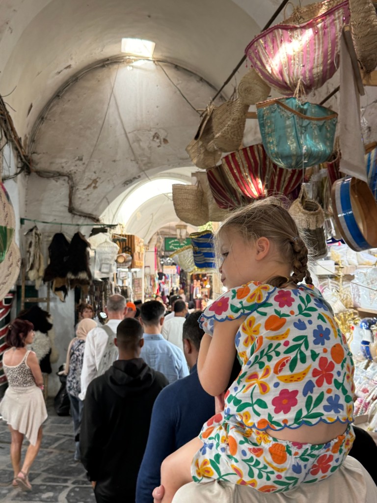 And then we called another taxi via inDrive to take us back to the Medina. This week is the first time Millie has traveled in a car without a car seat. It didn’t stop her from falling asleep immediately. As I was thinking about the potential lack of safety of no car seat, a moped with two helmetless toddlers on it zoomed by and I was reminded that everyone has different access to and definitions of safety.