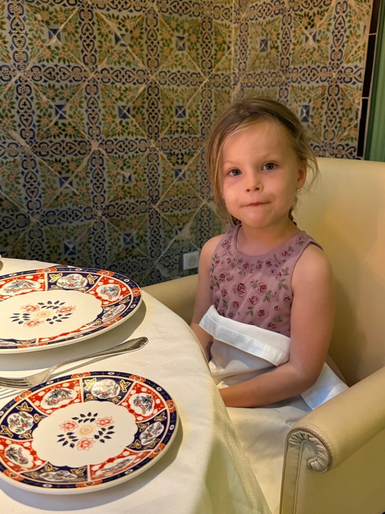We made the short walk to the fanciest restaurant in town. We put on the nicest clothes we have, which are not very nice. As we sat down, Millie gasped at the quality of the napkins and said “I think these are real silt!” (Silk)