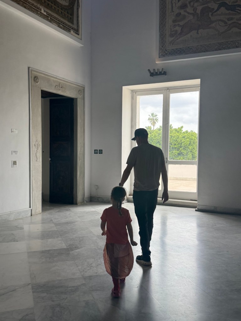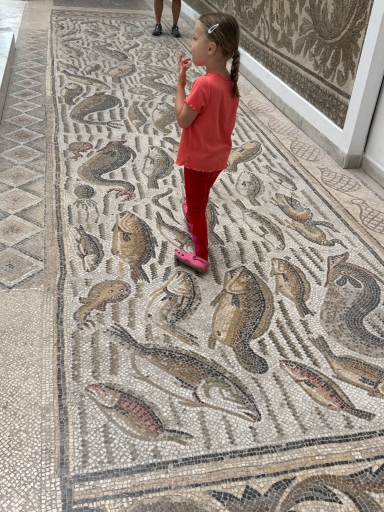 The museum was extensive. My favorite part were the huge, detailed Roman Mosaics. Nick has been reading about the Carthaginians, who populated this region before the Romans, so he liked seeing all their things. Millie liked the intricate ceilings and pink chandeliers.