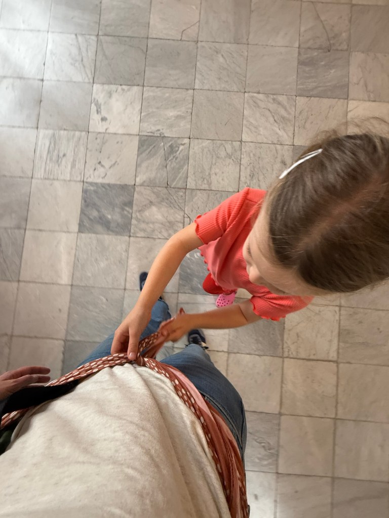For the most part though, she is over museums. Or at least the ones where she can’t touch stuff. She played with my scarf most of the time, turning it into different outfits or props and making up stories. She pretended to be a baby on the bench. She wore it as a super hero cape. She made it into an apron and took our order. At one point she tied the scarf around me and said I was a dog that she was taking on a walk. I’d rather be taken on a walk than listen to whining about being bored. She didn’t pay an iota of attention to the museum but she was happy and not disrupting any guests, so we left her to it.