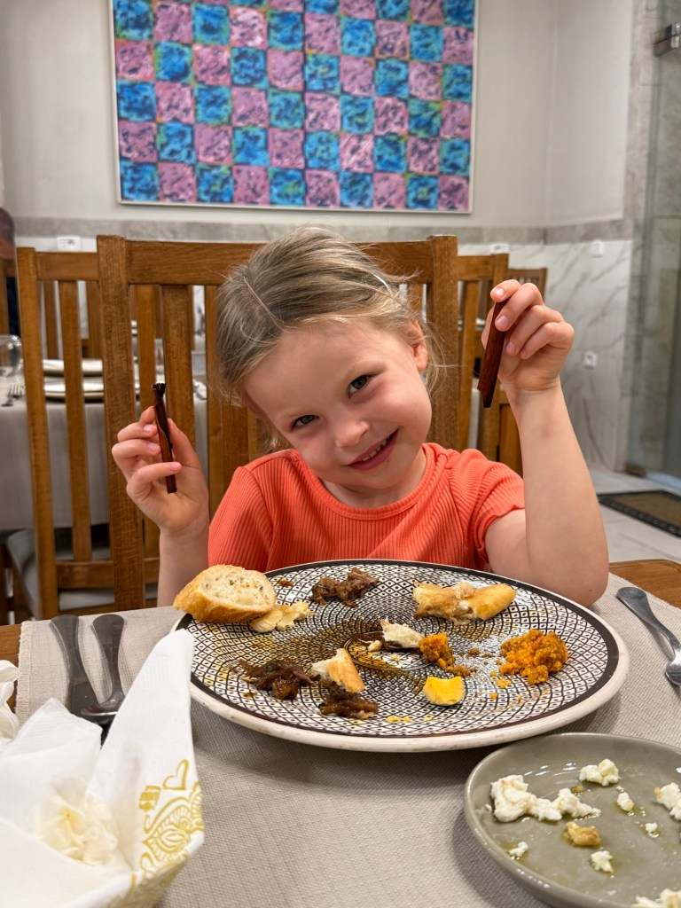 We were too tired and too hungry to wait until 7:30 again for dinner and luckily found somewhere that was open for us early birds at 5:30. Millie once again mostly ate bread and some lamb, but tried some things. She spent most of the meal chewing on the cinnamon stick that was in nick’s stew.