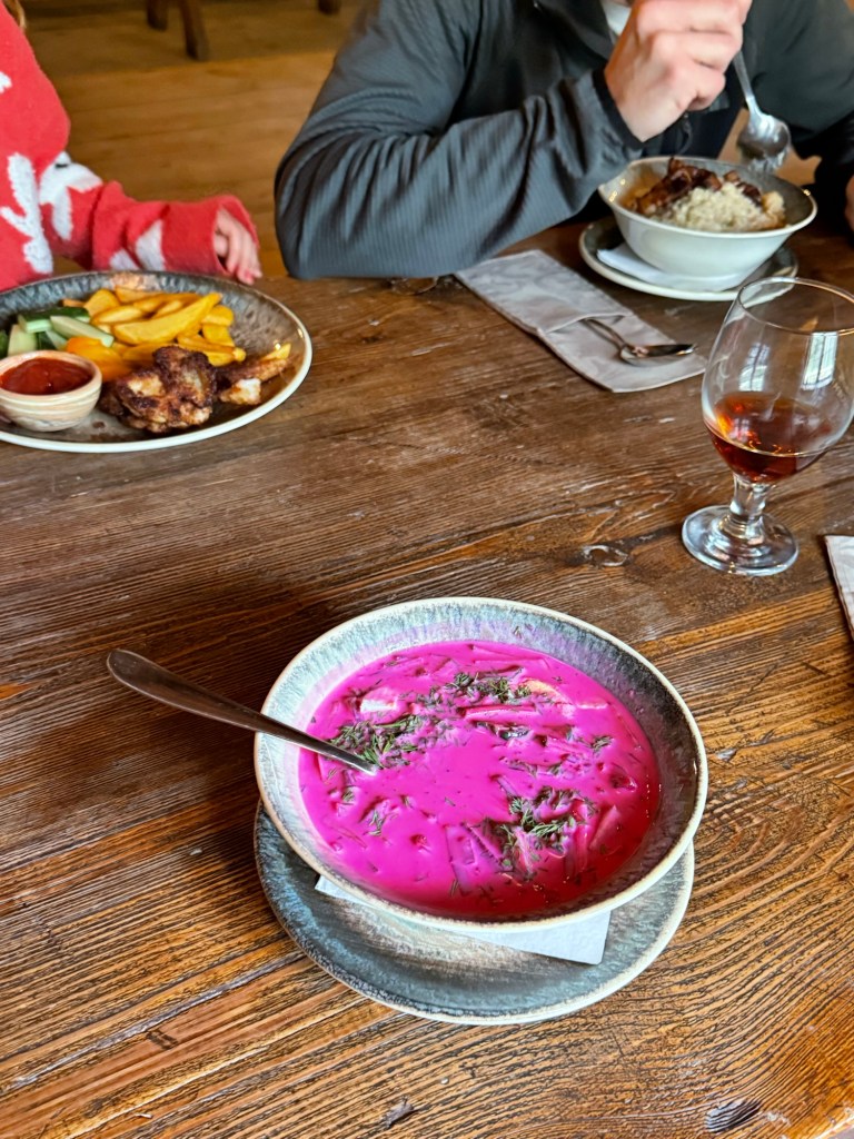 We got a bit lost on the trail and by the time we got back to the authentic 1600s pub building we were starving. I ordered a warm Latvian goulash soup and they accidentally delivered me a cold pink soup. I took this as a sign from the universe to try it again and I’m glad I did. I know there is a rivalry between Latvian and Lithuanian pink soup — there are even diss tracks between the countries. I am officially team Latvia on this one. It was more creamy, less yogurty, sweeter and tangier from the pickled beets, kind of mustardy, and had more herbs. I finished it this time.