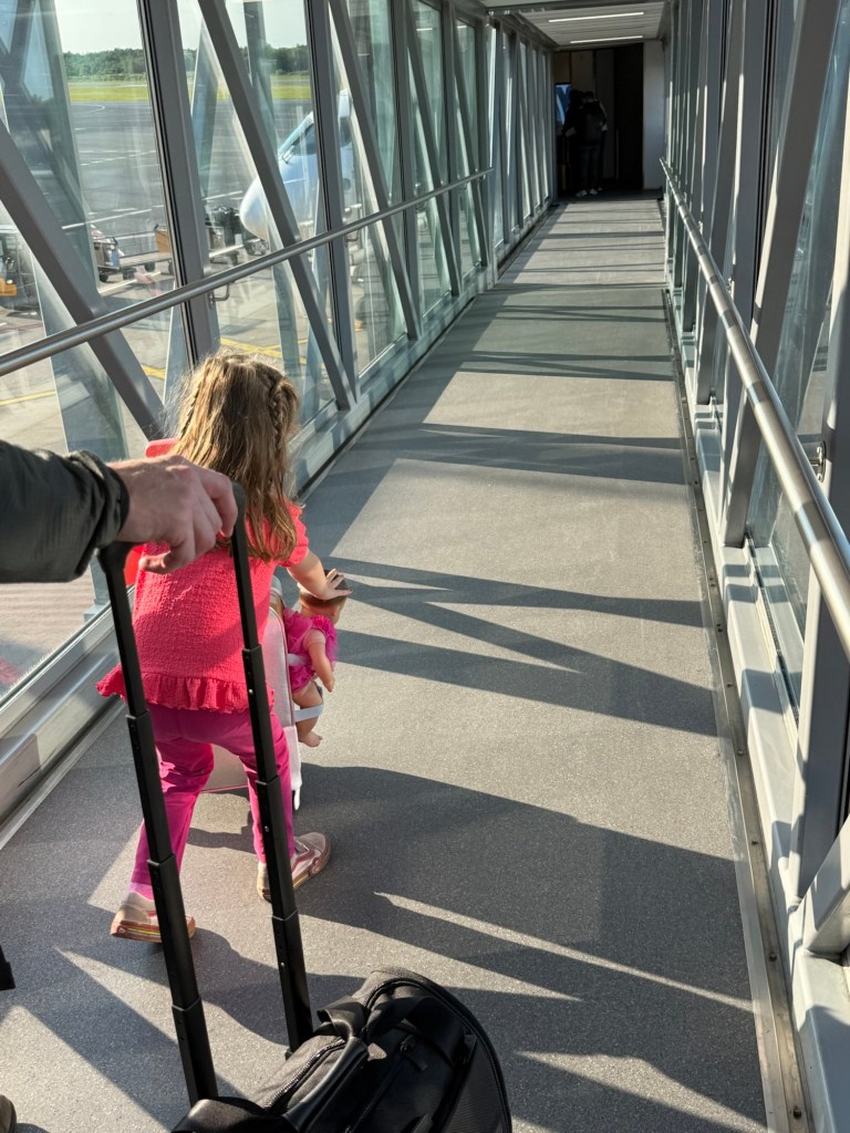 It was a rough night of sleep for everyone – I think I slept about 3 hours total. Millie came into our bed and breathed her hot breath directly into my face all night. When our alarms went off at 5:30AM she was still warm but had a lower fever than the night before and seemed mostly fine. Good appetite, good mood, no coughing, no gastro issues. So we headed to the airport for our flight to Amsterdam.