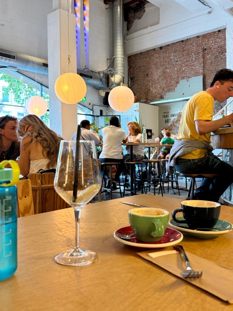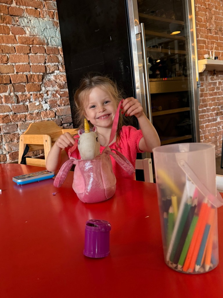 We landed at 9AM and took the bus to our hotel. Check-in wasn’t until 3 so we had a whole day to kill with a kind of sick and very tired Millie. From our hotel we walked to a delicious brunch. They served Millie’s kombucha in a wine glass which made her feel very fancy.