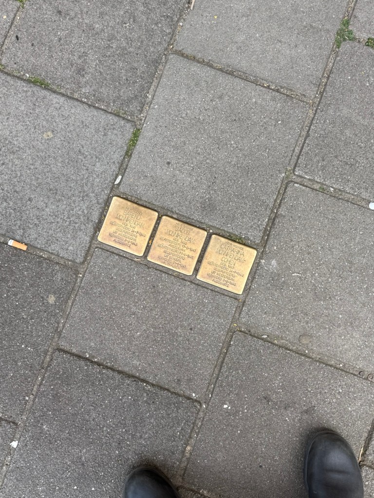 We walked to where the camp will be so that she could get familiar with the building and area before we drop her off in the morning. She noticed stolpersteines in front of the building and excitedly said “look, gold bricks like your grandparents!” This then led to us attempting to explain the holocaust in an age-appropriate way, which is impossible.