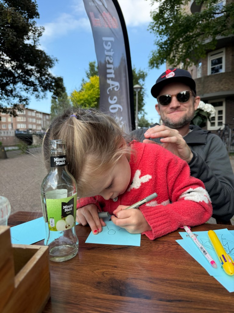 We took our time and leisurely walked over to pick up Millie. From camp we walked to a canal-side cafe to have an early dinner. This felt like a real hole-in-the-wall place and was the first place we’ve visited in Amsterdam where the server didn’t speak much English. Millie happily drew and watched the ducks and told us about her day. She drew me giving her a piggyback ride and Nick giving her a shoulder ride. Very common occurrences. We ate a platter of Dutch meats.
