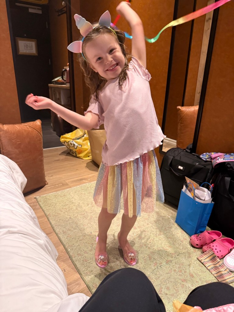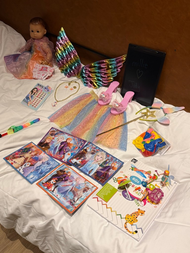 She got: unicorn dress up clothes, nail stickers, drawing pad, new markers with skin colors so she can stop drawing exclusively yellow people, Frozen puzzles, a rainbow twirling ribbon, balloons, and some playmobil people.