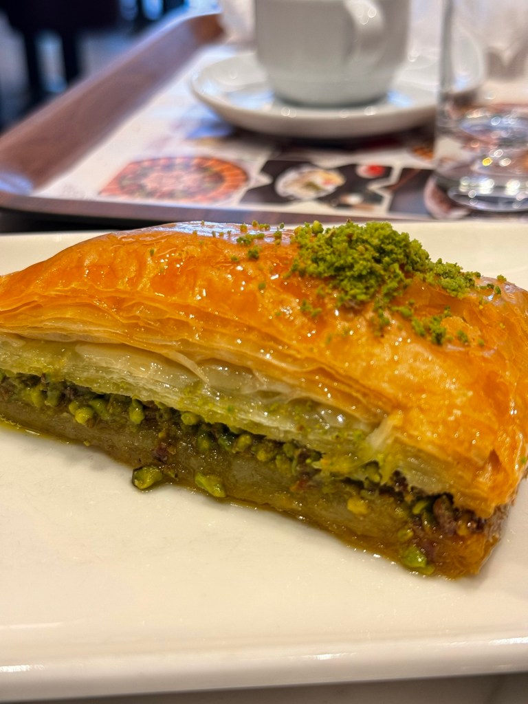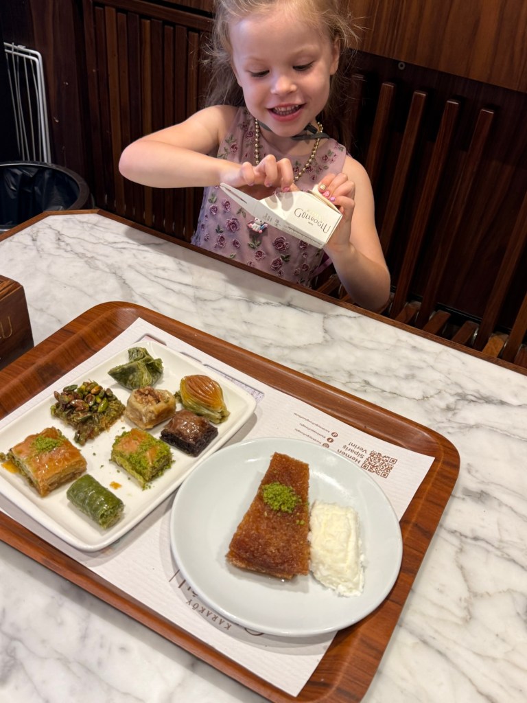 We ordered too much: a sampler platter with some add-ons, a walnut baklava, a chocolate one, some very sweet cake, and a side of Dondurma, a Turkish ice cream that famously doesn’t melt. You can imagine Millie’s excitement that we were having ice cream on a Tuesday morning. We both took our first bites, and looked at each other with “wtf” looks. It was very strange! Felt like eating hard whipped cream. Almost like a thick crisco. We didn’t like it.
