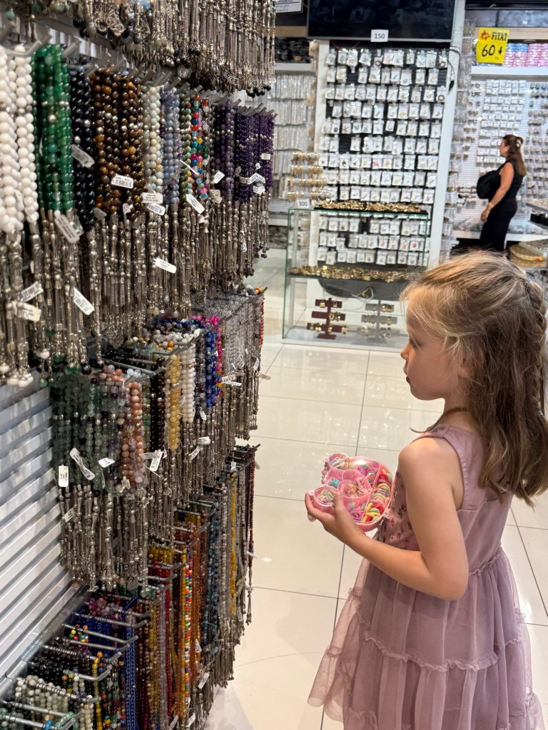 Fully stuffed now, we started to walk to the Grand Bazaar which is the giant market of everything. We got as far as a bazaar-style Claire’s, where we let Millie pick out one item of cheap crap. We are trying to say yes to more.