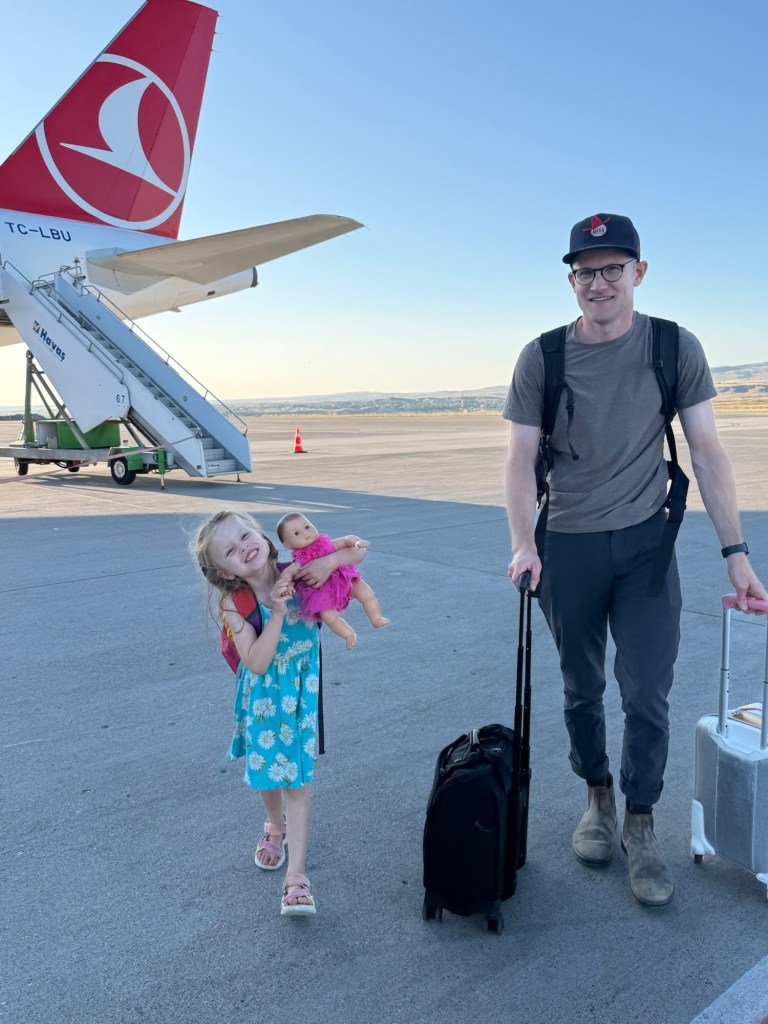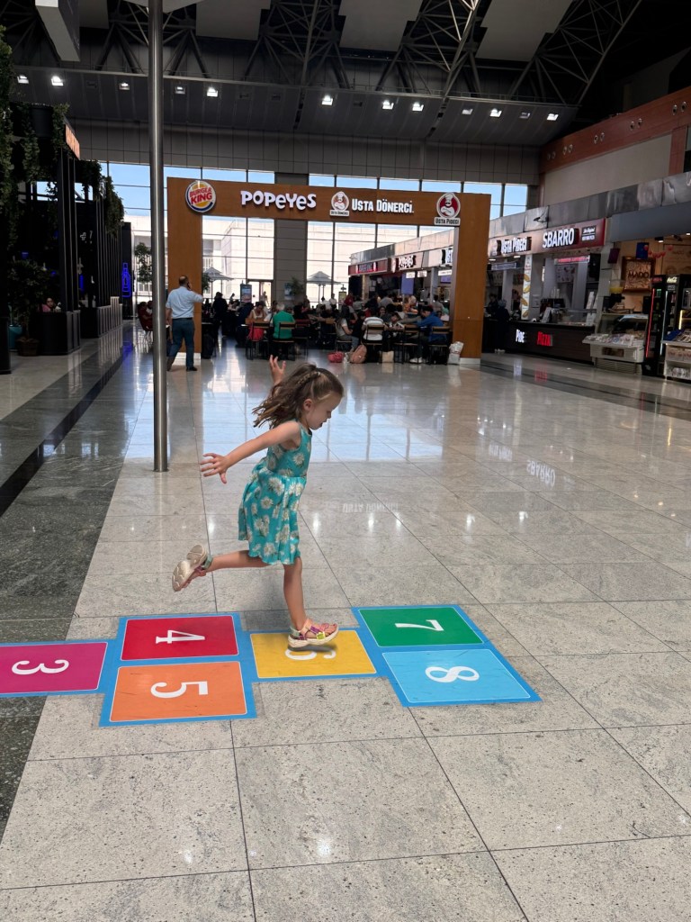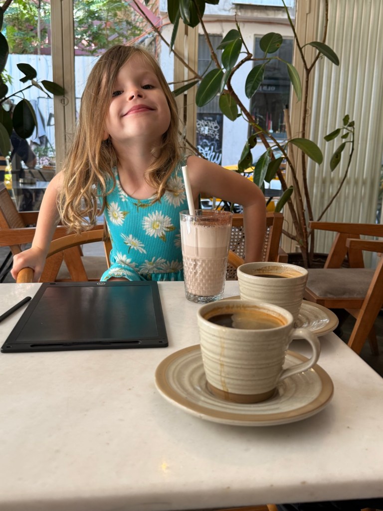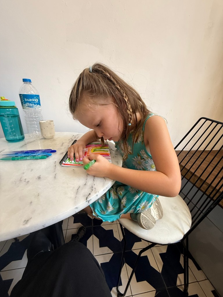 We packed up our Airbnb, stored our bags in a nearby hotel, and took a taxi over to another Annette & Murat recommendation: their favorite kebab place. We each got small ones and even Millie enjoyed it. We slowly headed back to our bags and waited for our ride to the airport. The little artist drew and drew.