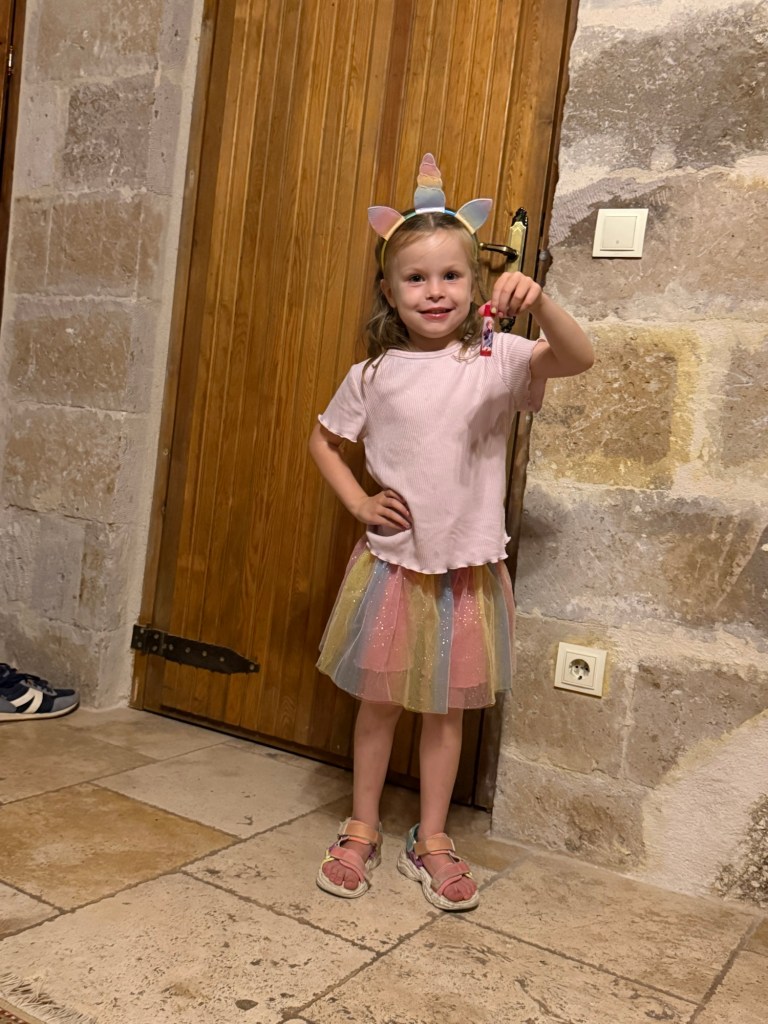 Even though it was past bedtime by this point, we needed dinner. Millie got dressed up (unicorn horn, tutu, extra chapstick) because “it’s a special birthday dinner”.