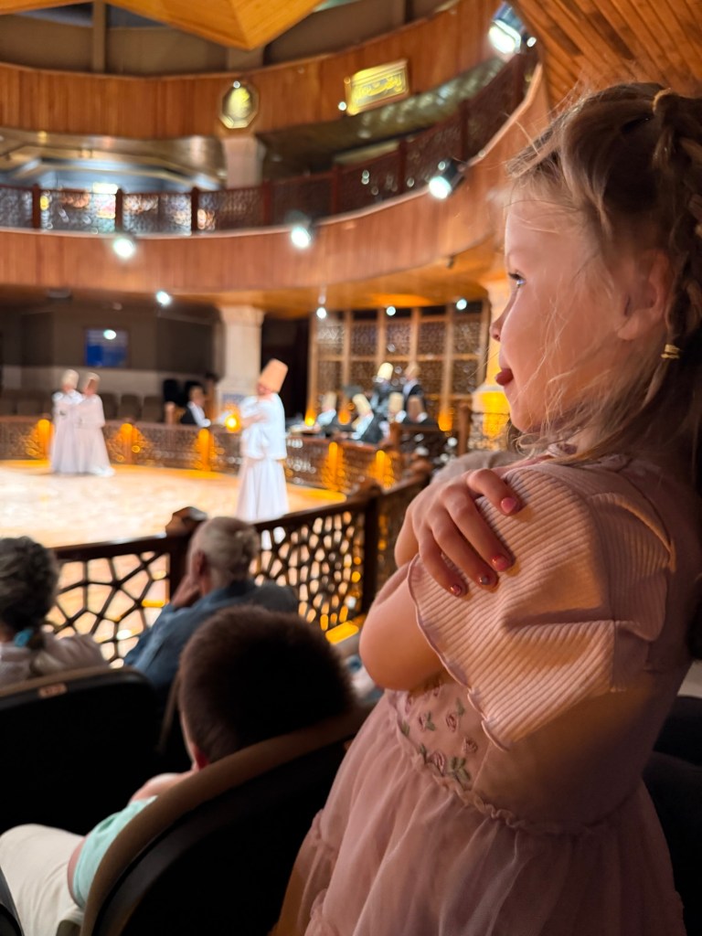 We had talked up a big game to Millie that this would be a special performance of men dancing, kind of like Ballet. She was very confused when the first 20 minutes were just men in black cloaks and tall hats walked slowly in a circle and kissing the ground while someone recited a prayer. But she was patient and eventually the whirling began. It was a memorable experience.