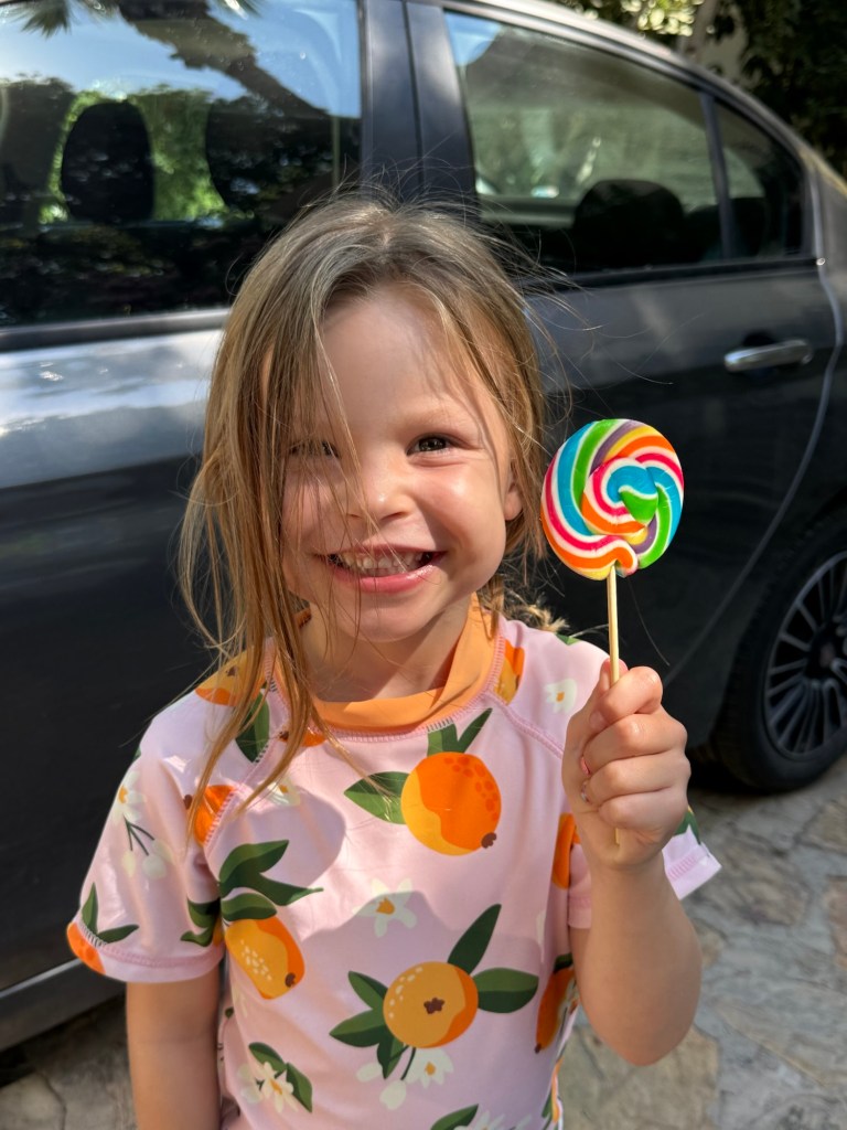 We put on our bathing suits and sunscreen layer #1 and went to get water and beach snacks. Today is Ice Cream Friday but at the shop Millie eyed something she has been wanting for a long time: a classic rainbow lollipop. We agreed she could have that instead of ice cream today. She was ecstatic.