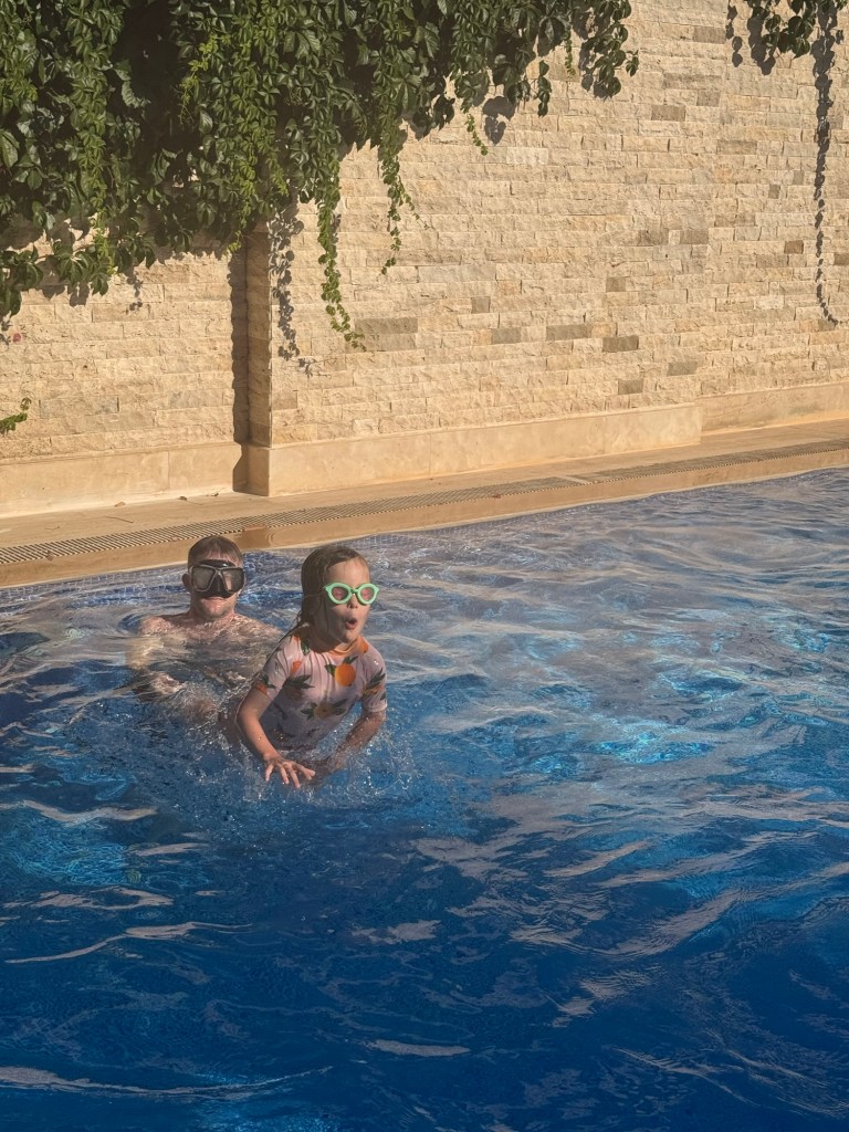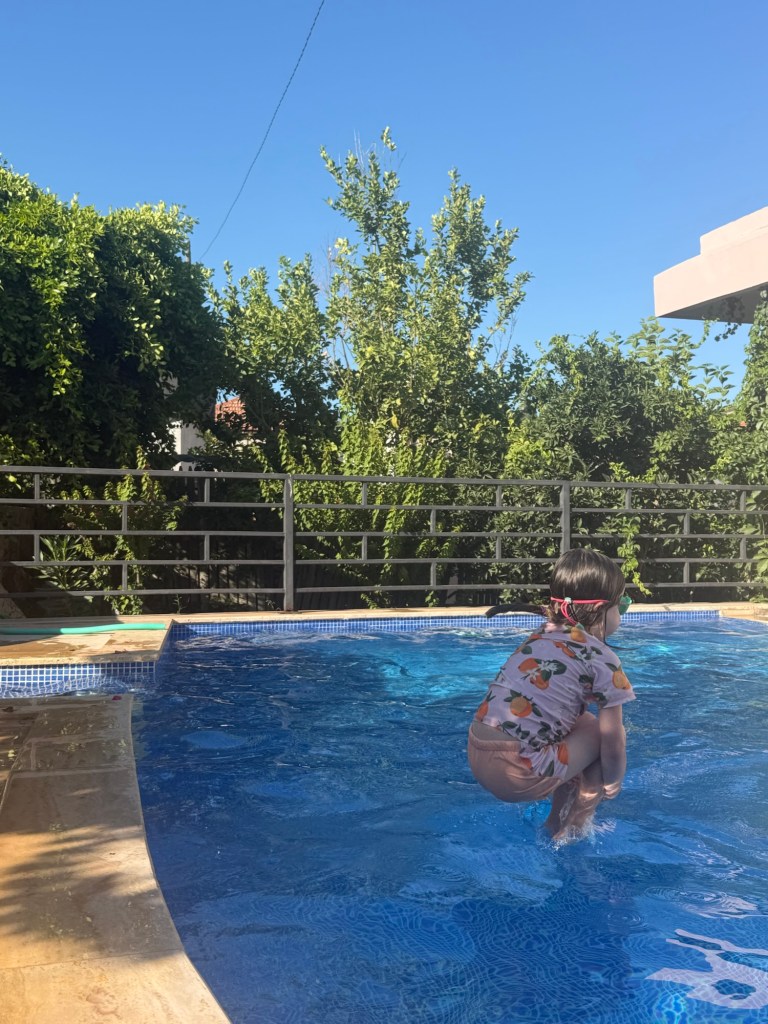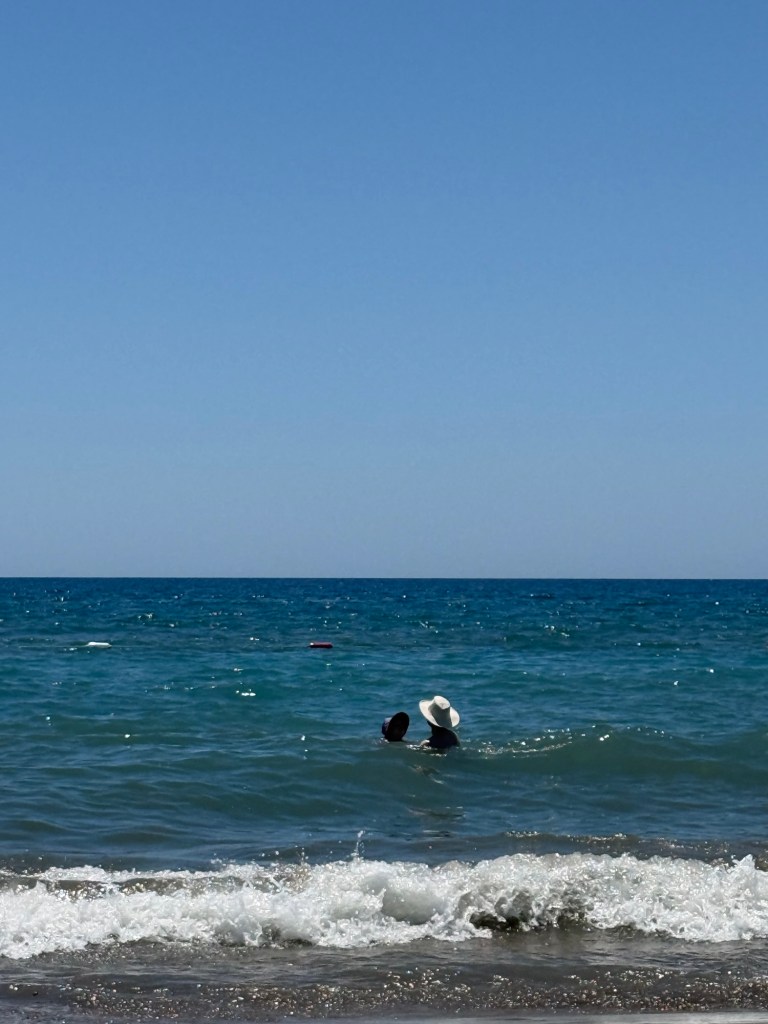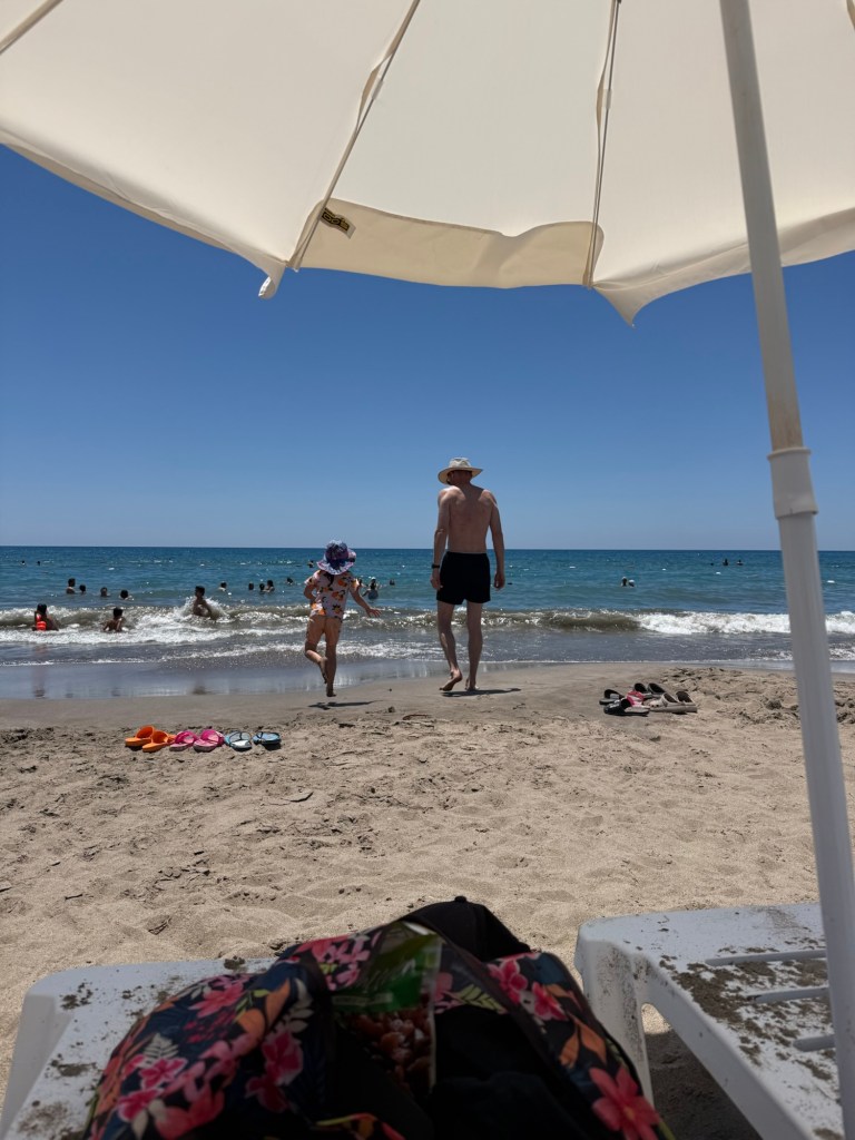 We quickly moved on to the beach so we could jump in the water to cool down. This beach felt very different than the last one we were at. There was soft sand instead of painful pebbles, and the ocean had more waves. The combo of waves and sand meant the water visibility wasn’t great, so no snorkeling. We took turns swimming with Millie in the ocean. She couldn’t get enough and after a couple of snack breaks and sunscreen reapplications we had to drag her away.
