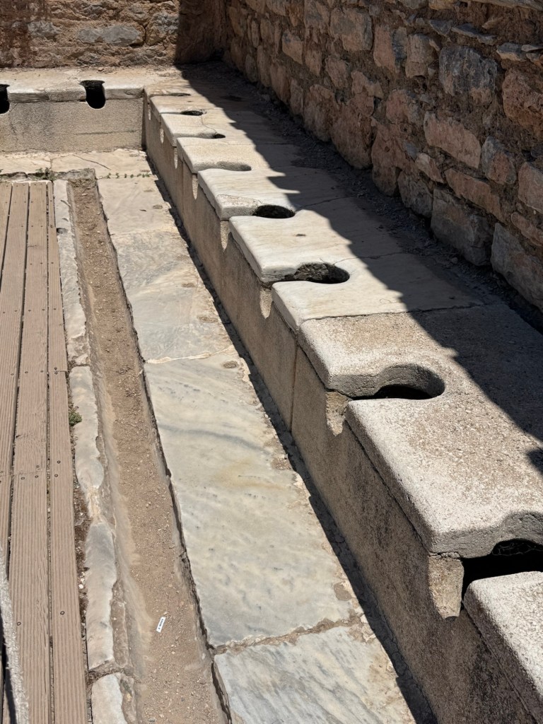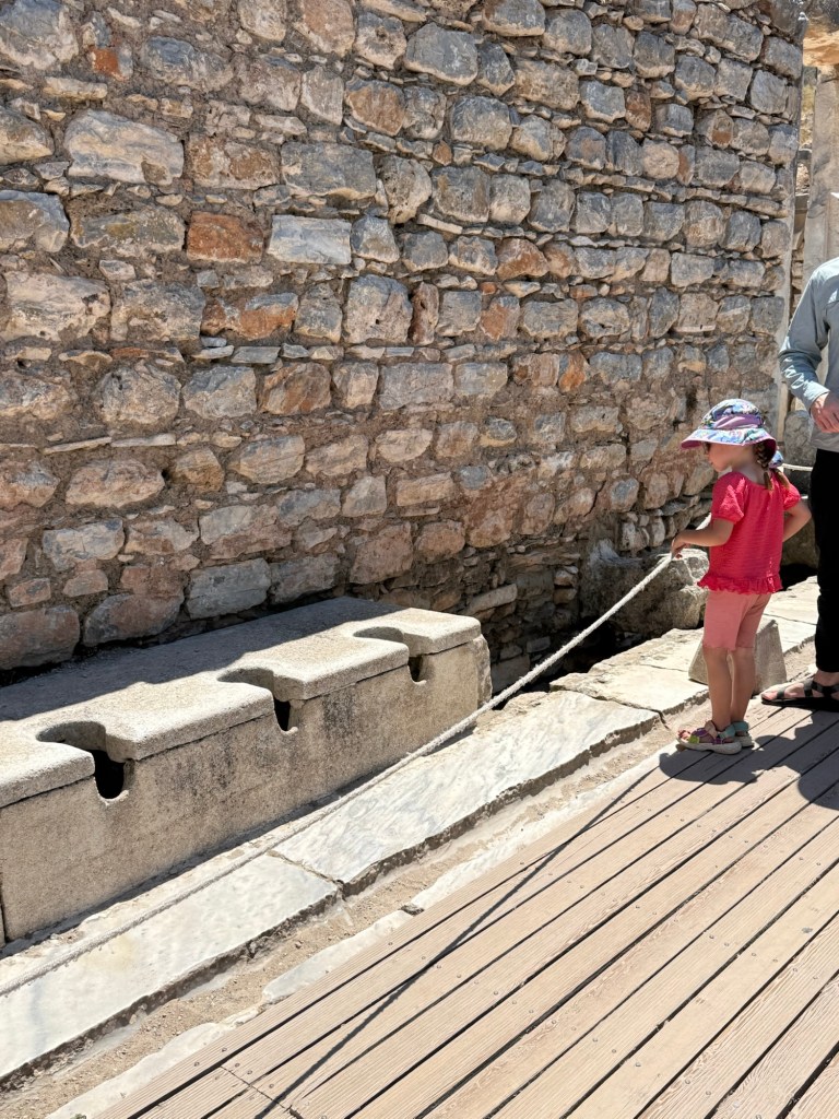 It was hot but we soldiered on. Millie’s #1 interest in any set of ruins are how and where the people peed and pooped, and luckily Ephesus delivered. Latrines for days. Can you imagine relieving yourself in a line like this with other people?