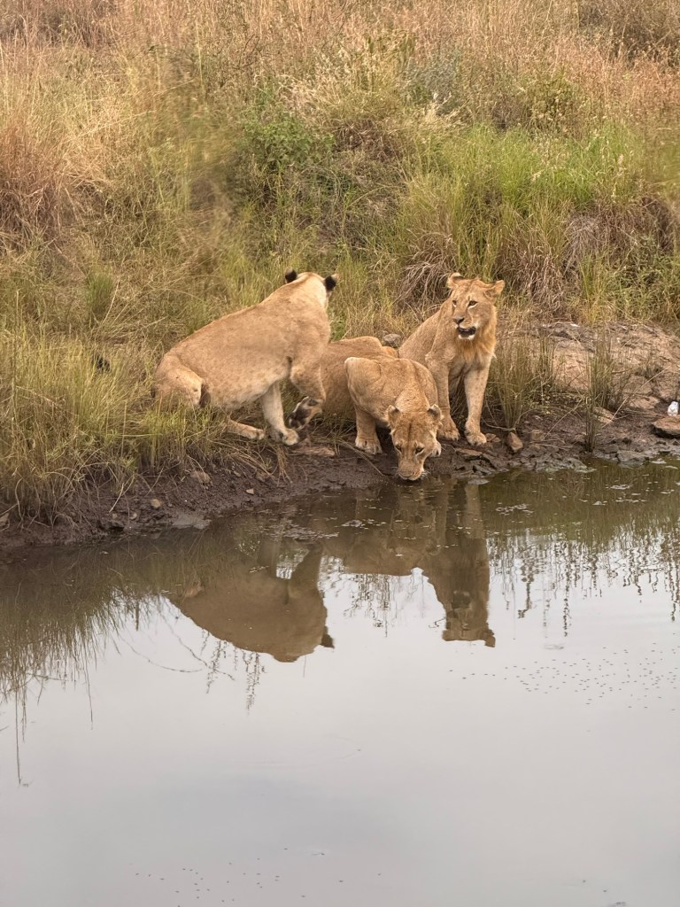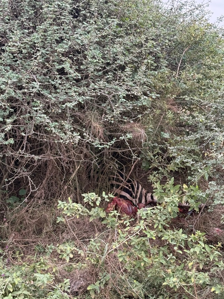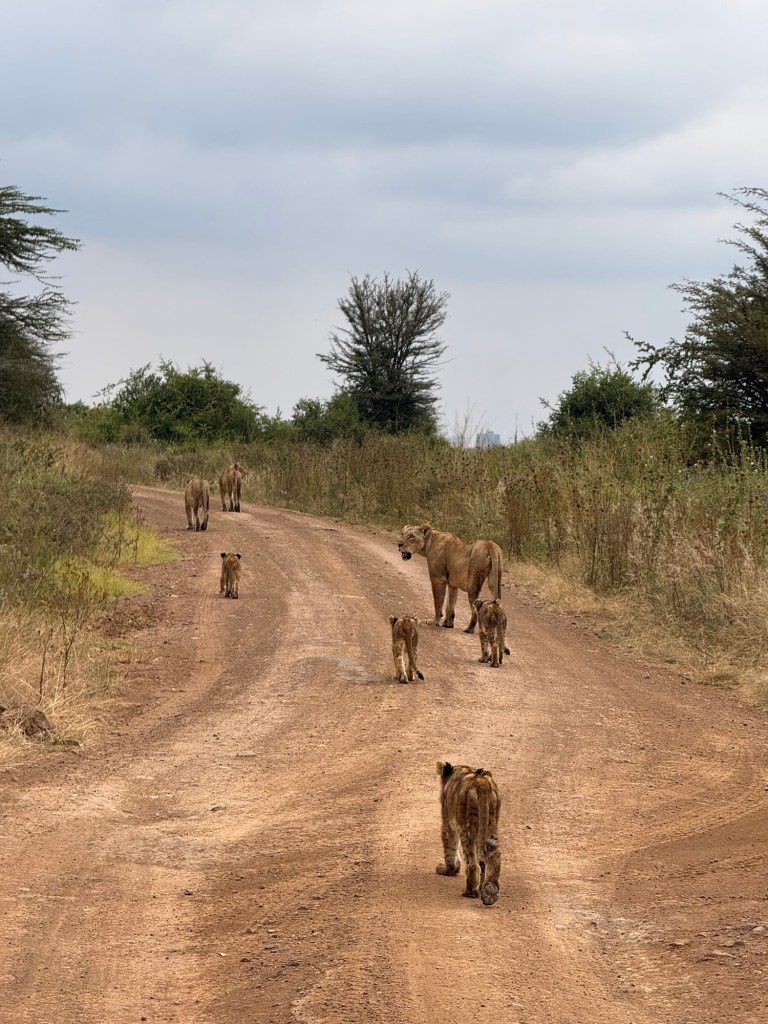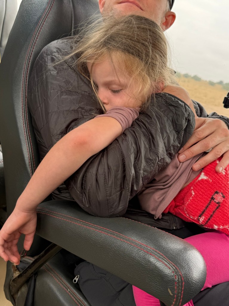 We saw a male lion hiding in a bush eating a dead zebra it had just killed. Bad photo but incredible to witness in real life. The zebra’s legs are all broken, and its guts were splayed out and half-eaten. Sweet Millie’s only question was “was the zebra old so it was going to die soon anyway?” We said yes to soften the blow.