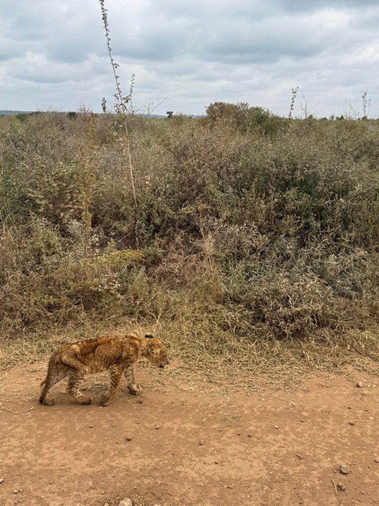 A baby lion that had been separated from its mother and siblings. It was apparently the runt and too slow and weak to keep up, so the mother left it behind. As it walked it cried out the saddest cry. My maternal instincts kicked in and made me tear up and want to go out and save it. Millie felt similarly and was so worried about it. I wish we could have done something beyond witnessing a very real example of survival of the fittest.