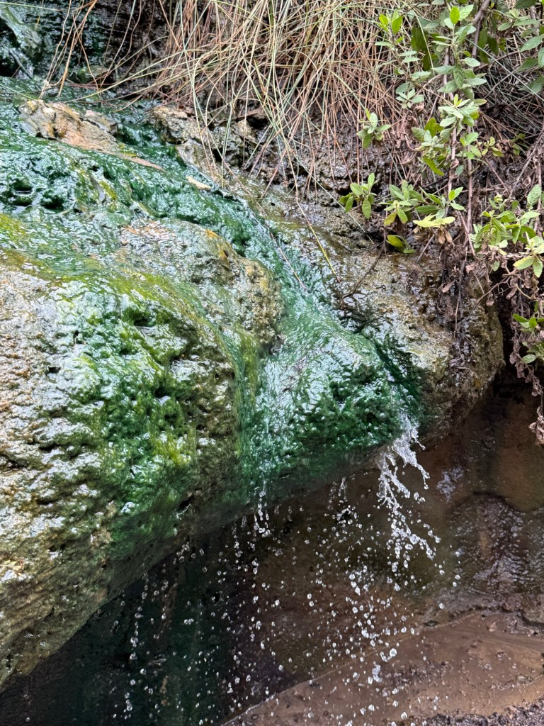 The water coming off the cliffs was from the hot springs. When we felt it, it was way hotter than we expected. Like a hot shower. The minerals in the water cause this bright emerald green algae.
