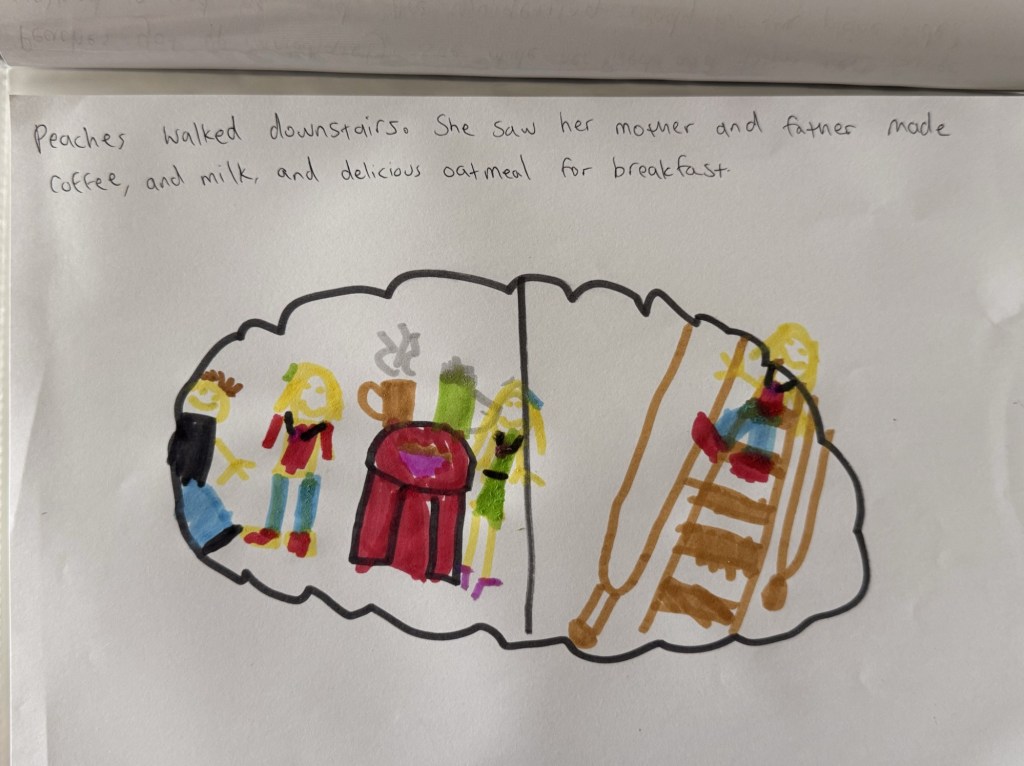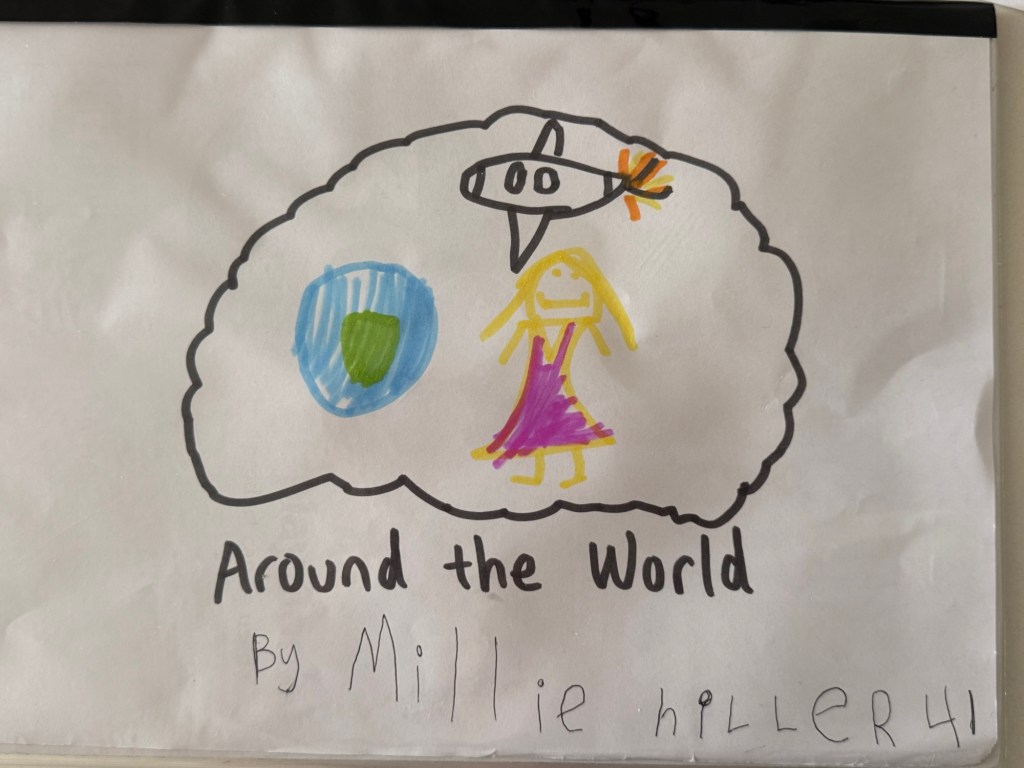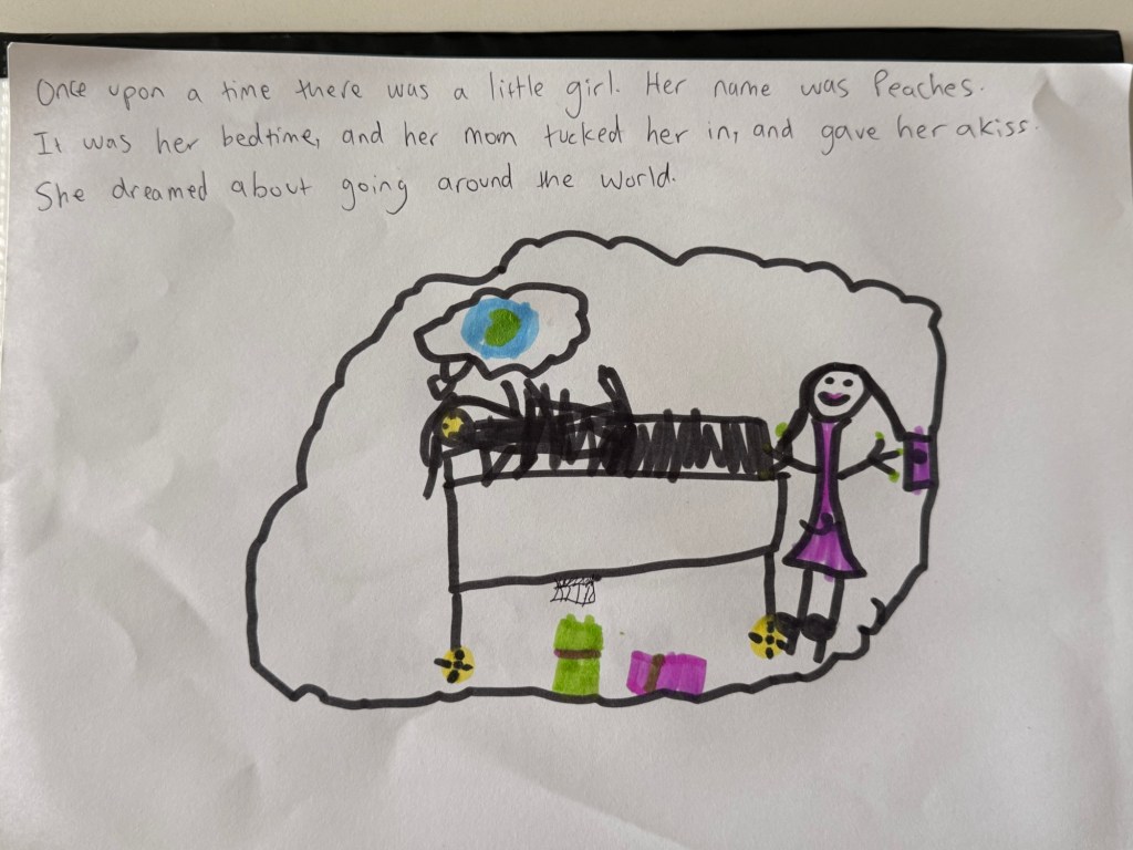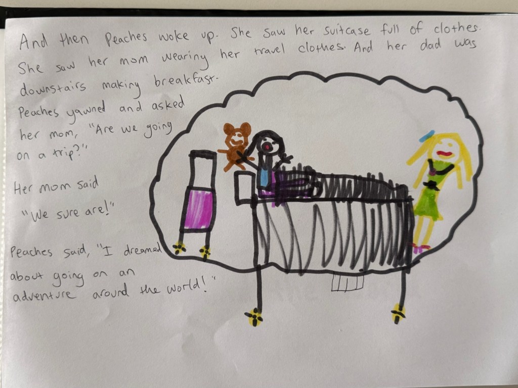 We came back to the Airbnb and Millie got very into creating her first book, all about a girl named “Peaches” who travels around the world. She thought of each page entirely on her own and dictated the story to me to write.