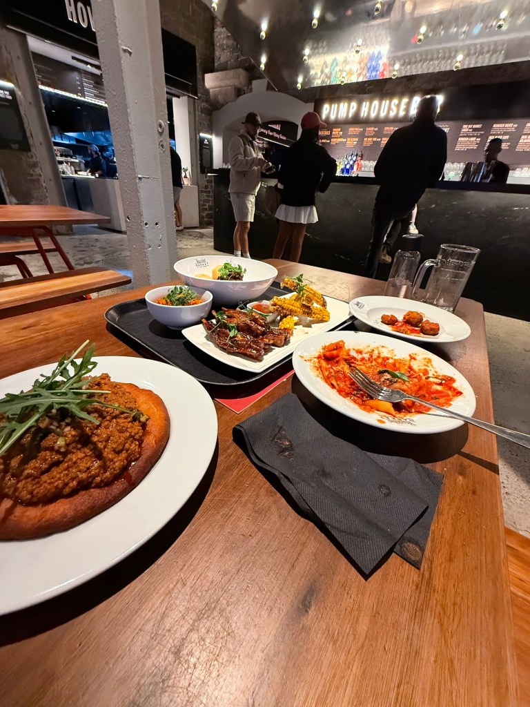 At about 5pm we dragged Millie away and walked 20 more minutes to the Time Out food market. I like food halls when traveling because we can get a variety of various things, and it’s casual enough for Millie to not feel constrained. She had pasta and arancini and Nick and I split some South African specialties, lamb ribs, oxtail stew, some sort of spicy pickled thing.