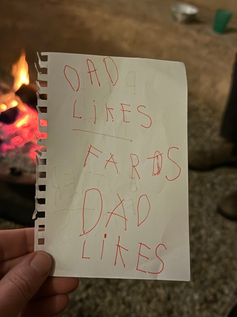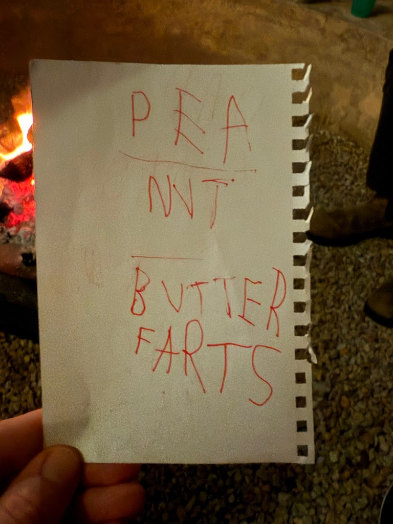 They set up a full campfire for us to welcome us. We sat by it and Millie made some “inventions” (horrible food concoctions we were forced to taste) and wrote a love note to her father.