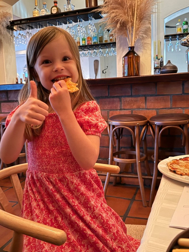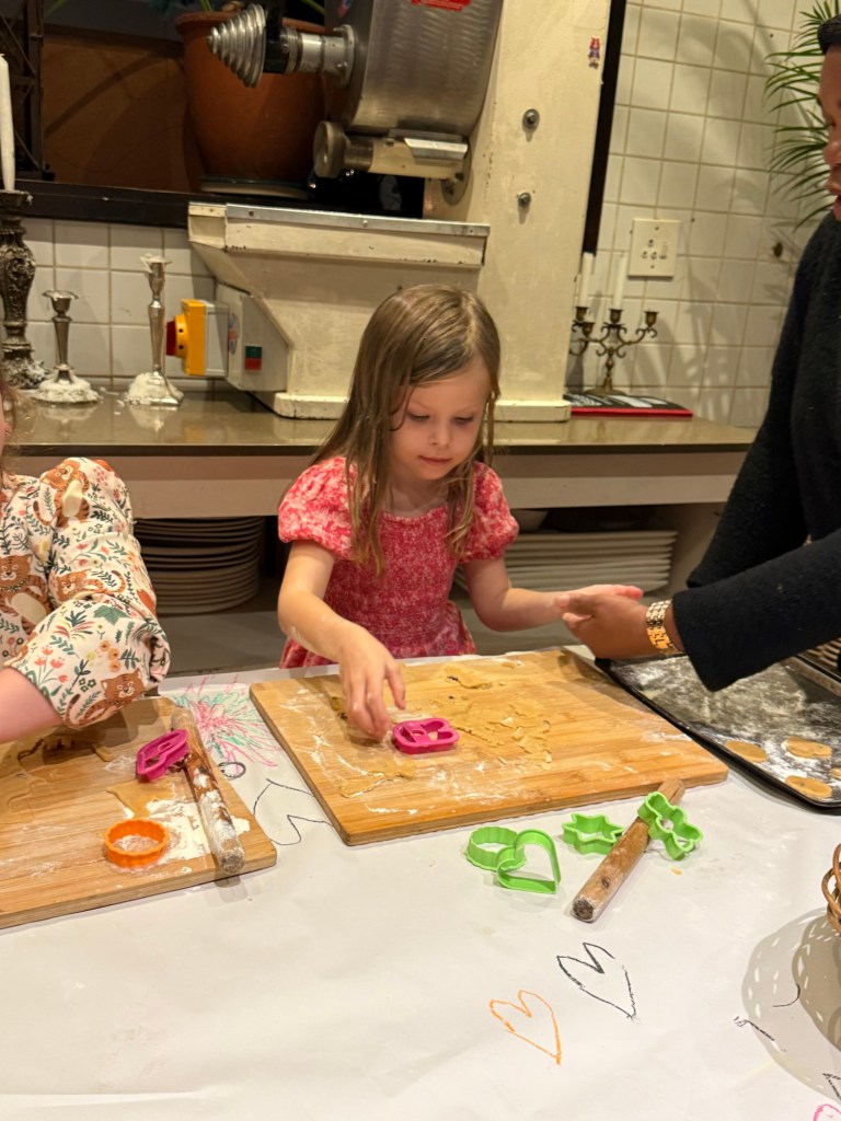 The memorable thing about it? Their kids menu is interactive. Instead of ordering a pizza, they allowed Millie to go back into the kitchen, roll out her own dough, add sauce, and choose her toppings. When she was done eating that, she and another little girl spent 20 minutes rolling out, cutting, and decorating cookies that she proudly brought back to the table for us.