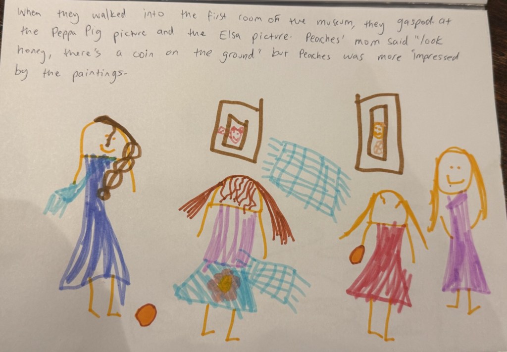 Millie listened to stories, played cards, and worked on her second book (“Peaches goes to the museum”). She is finally able to somewhat entertain herself without our constant involvement.