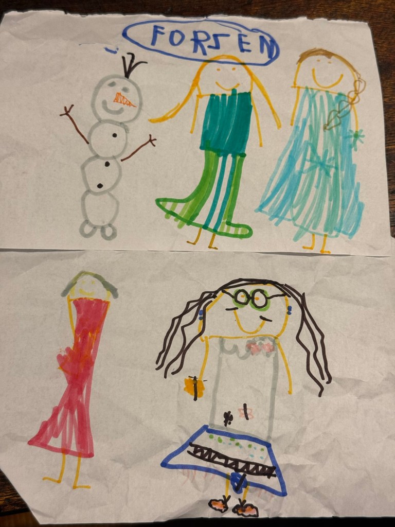 She did lots of great drawing that she frustratingly crumpled up when she realized she’d made tiny mistakes. She spelled “FORZEN” from memory and we were like “wow you knew all the letters and only got one out of order!” which sent her into a spiral. Once again I would like to know how to discourage perfectionism in a kid.