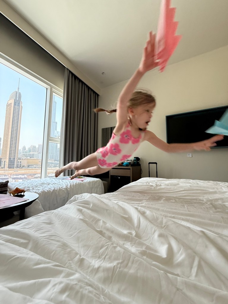 She and I hung out in the hotel room for a while, drawing, jumping between beds, and dancing.