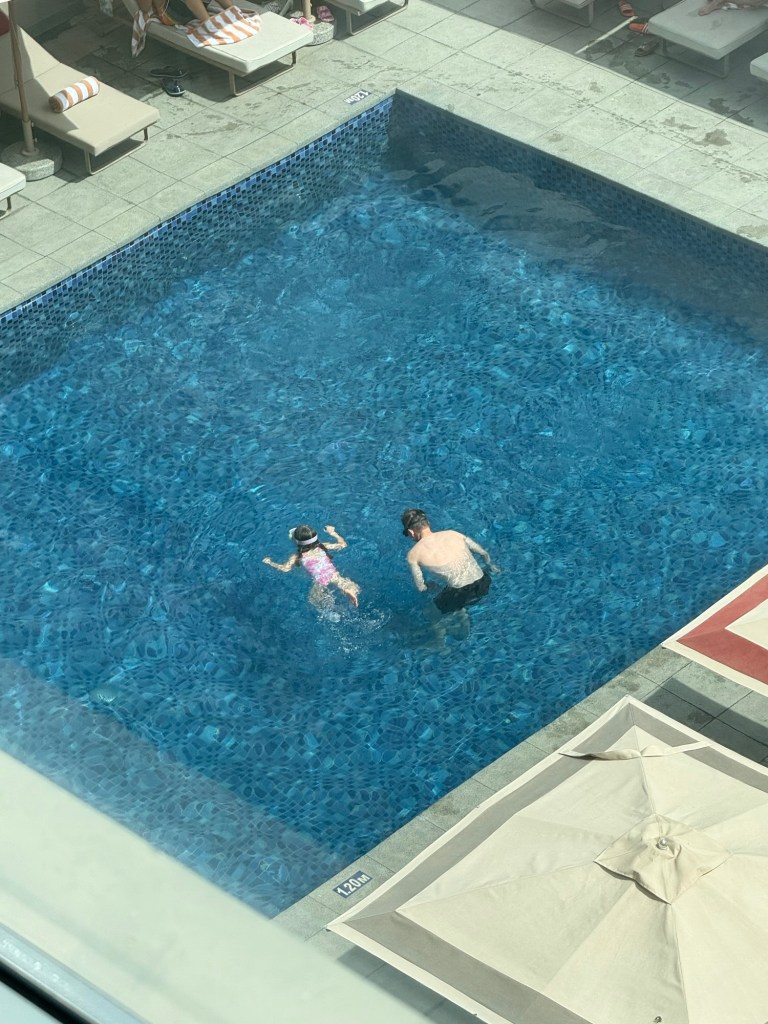 When he got back he took Millie back to the pool to test the snorkel while I sat in the room to do some hotel booking and budgeting. I occasionally stood up to look down at the pool to see how they were doing. 100% cuteness every time.