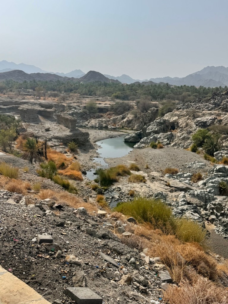 We drove 2 hours to Wadi Al Hoqain. We arrived to an empty parking lot and no signage. I got out of the car to look down into the valley. I took this photo for Nick to show him how much water was there. Some, but was it moving? Is it enough to swim? Are we in the right place?