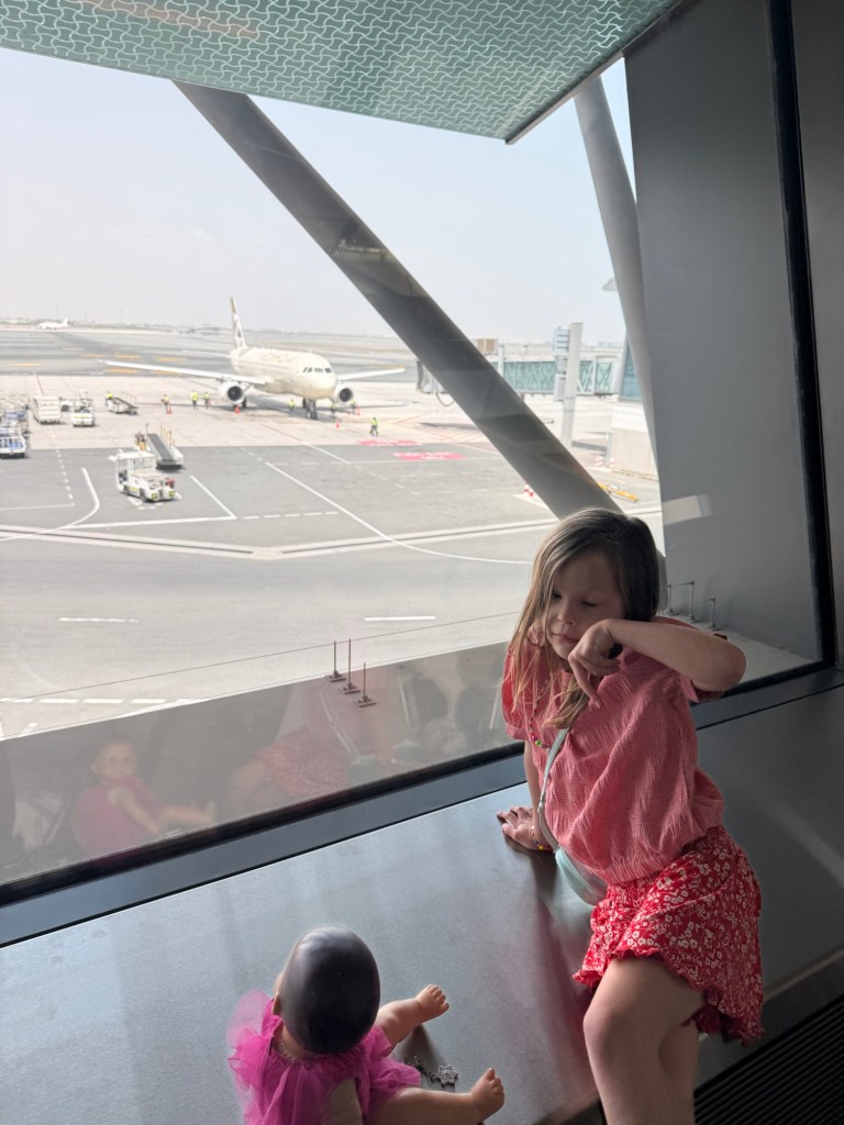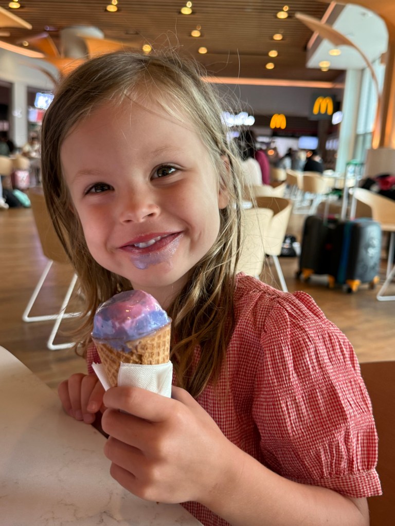 Long travel day today. We had another breakfast buffet at our airport Novotel. Good news: the tire didn’t deflate any more. We dropped off the car and gave them a heads up. We were pretty early, as always, and hung around the Muscat airport until our first flight. Millie couldn’t wait to have her Friday ice cream, so she got a 10AM cotton candy cone. Gross.