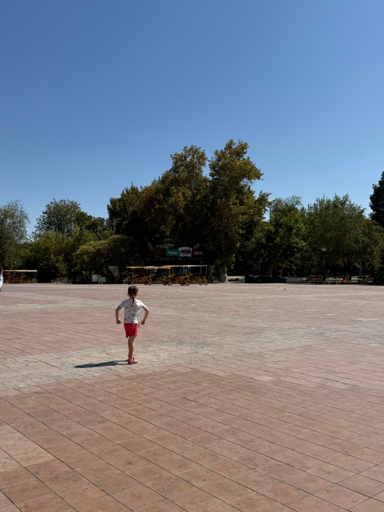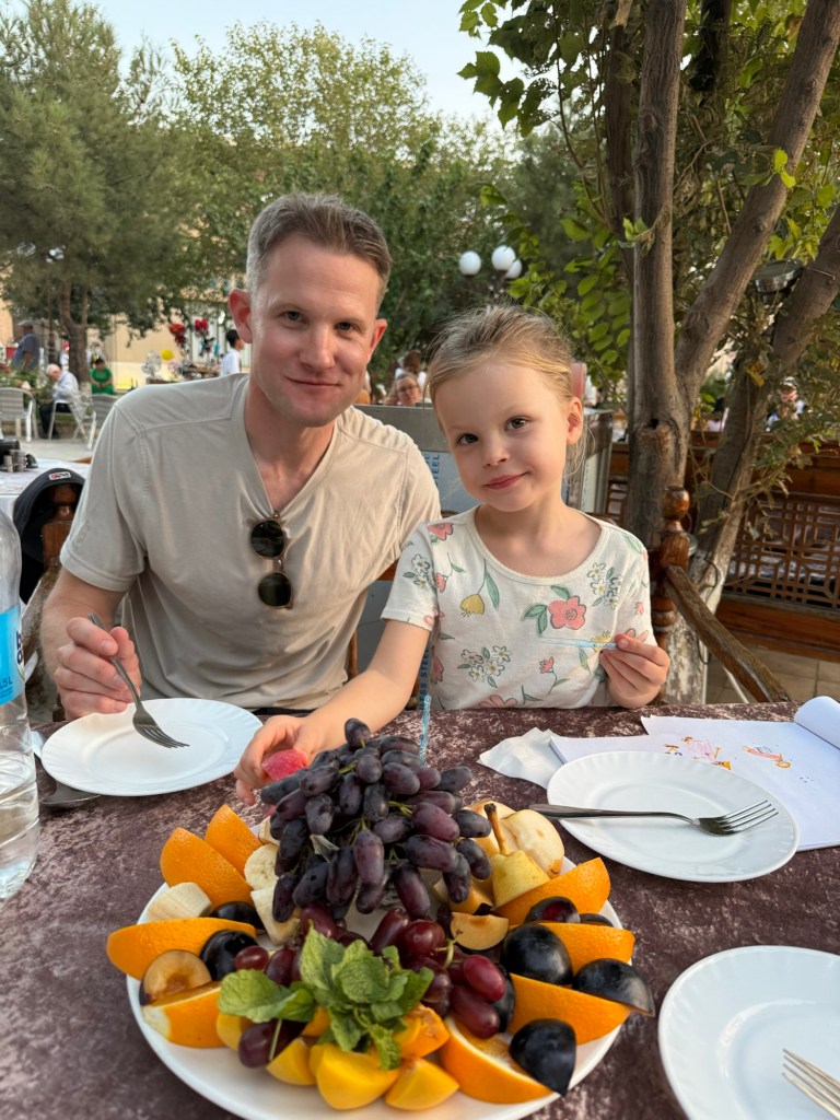 After a brief rest and cool down in our apartment, we headed out for dinner. We ate in the central square and once again Millie went to town on some dumplings. I was worried about what she’d eat when we get to China but I’m not anymore. We got a fruit plate for dessert and this gigantic platter arrived.