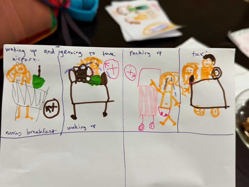 We also had a heart to heart with Millie about yesterday’s disaster day. We talked through all the reasons airports are difficult, and why we need to behave in them. We devised a plan where she gets a star for every step she gets through without incident. At the end, we will cash out the stars (details tbd) and she can buy herself something. She started illustrating the steps.