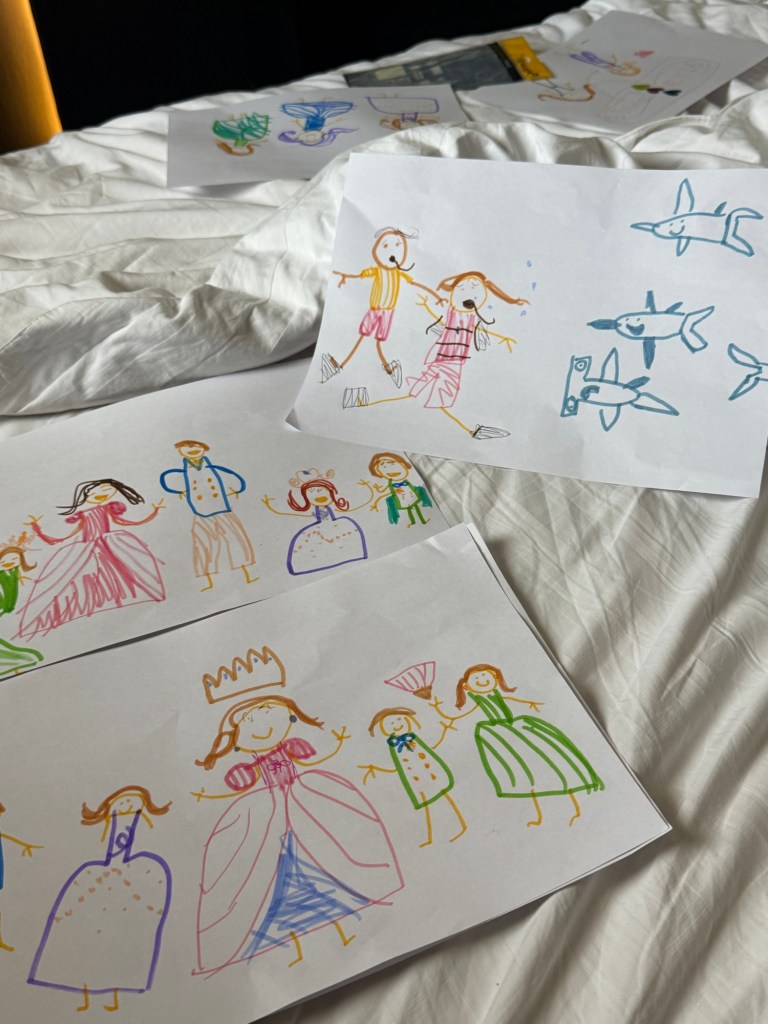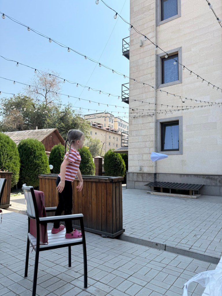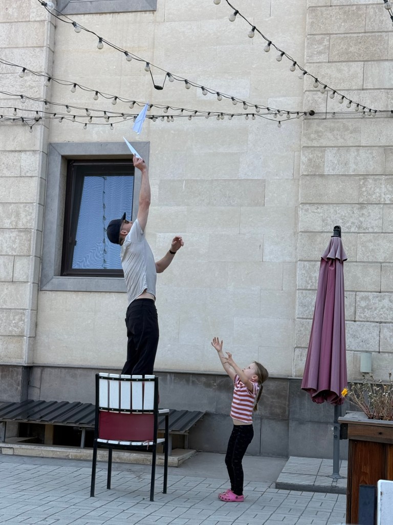 We checked out of our room at noon and left our bags in the lobby. We attempted to find a playground that was on Google Maps but didn’t actually exist. So then we came back to the hotel and spent hours on the patio. Millie drew and listened to music, and we spent a while making every variation of paper airplane shown on the internet. We did flying tests to see which was best. The winner was the simple traditional one.
