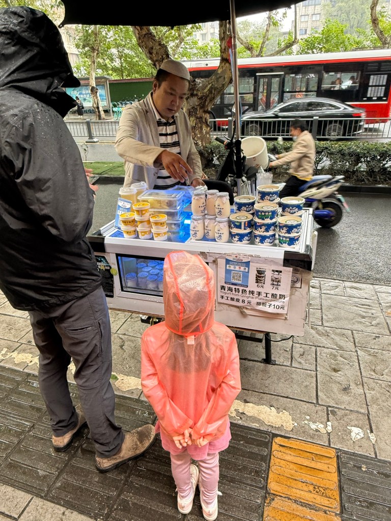 At about lunch time we headed out and walked to the people’s park, which is a large park in the center of the city. It was still drizzling but pleasant. Millie has been getting a daily yogurt from a street vendor, so we stopped for today’s.