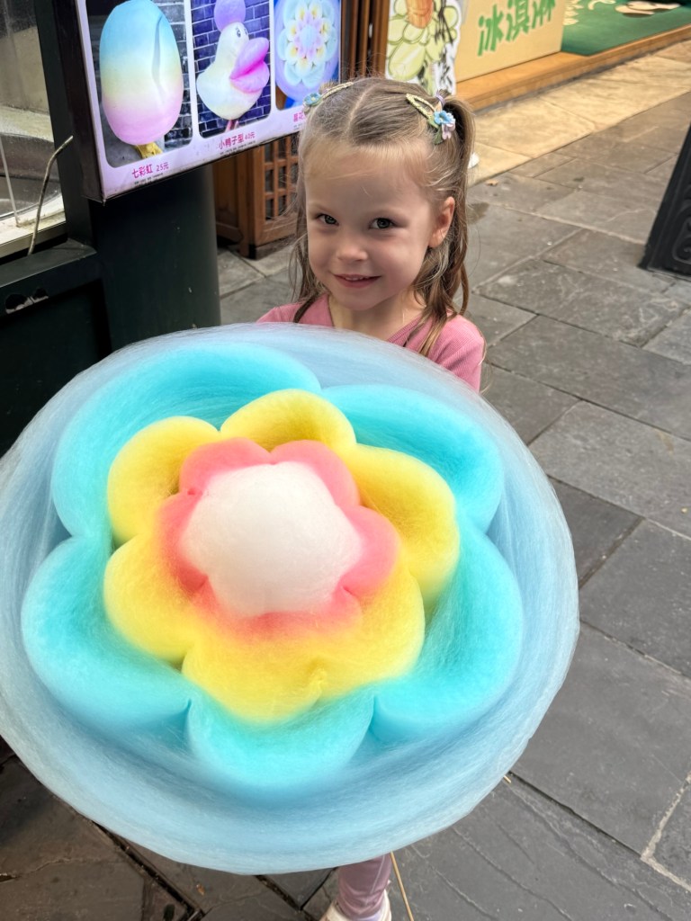 We walked past a cart advertising crazy looking cotton candy. In a moment of rare fun dad energy from Nick, he offered one to Millie. We looked on as the lady making it just made it bigger and bigger and bigger. Millie stood like this the whole time.