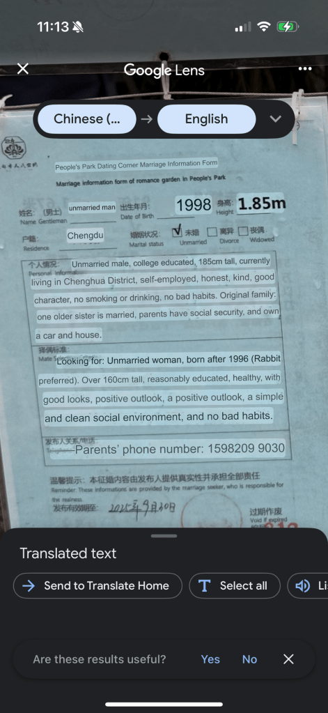 After our tea house experience we walked through the park. We saw this area that had lots of laminated papers hung up. They are singles’ ads, often hung up by the unsuspecting bachelor’s parents. I had a good time translating them.