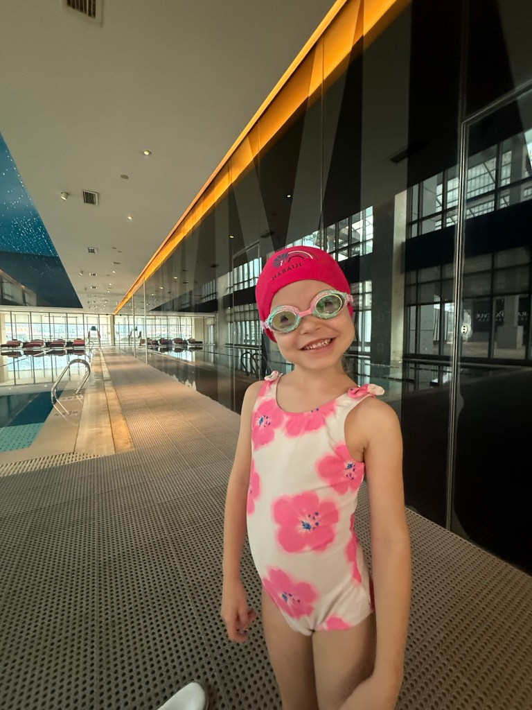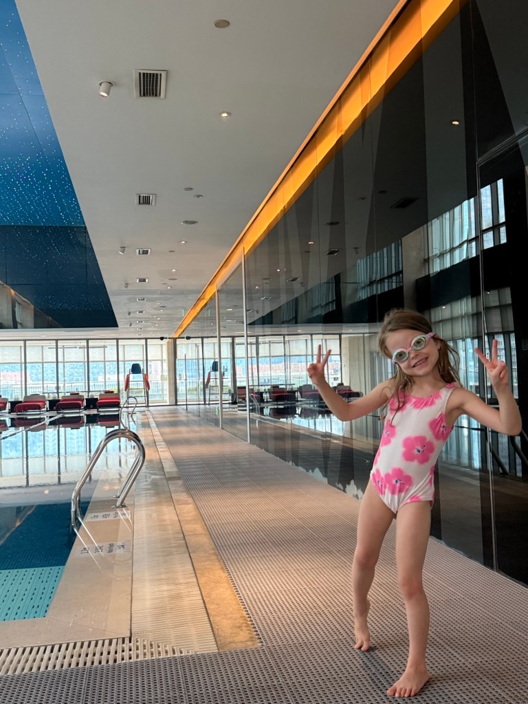 After a long nap I took her downstairs to the hotel pool. Once again they made us wear swim caps. They had a hot tub and cold plunge and we spent an hour hanging out in both. This was the highlight of the day, we had a great time just giggling together.