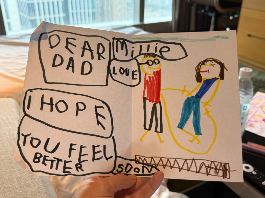 She was a trooper throughout the day and understood how rotten we were feeling. She kept checking in with us and saying “how are you feeling?” I don’t think she minded all the movies she got to watch.