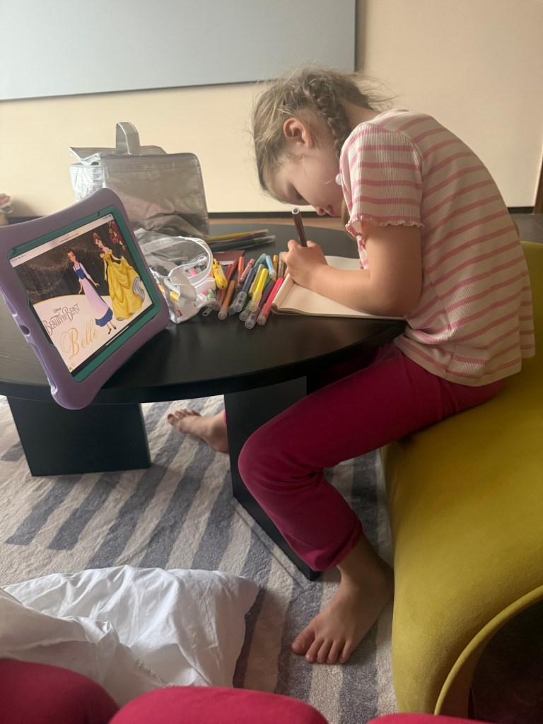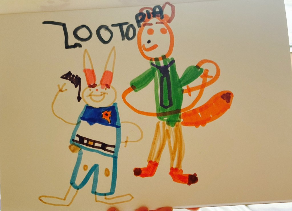 We woke up to cooler weather and a light drizzle. After breakfast we weren’t rushing out into it. Millie played and drew for a while. She likes to pull up pictures on her iPad and draw them. She busted this one out of the zootopia characters that I thought was so good.